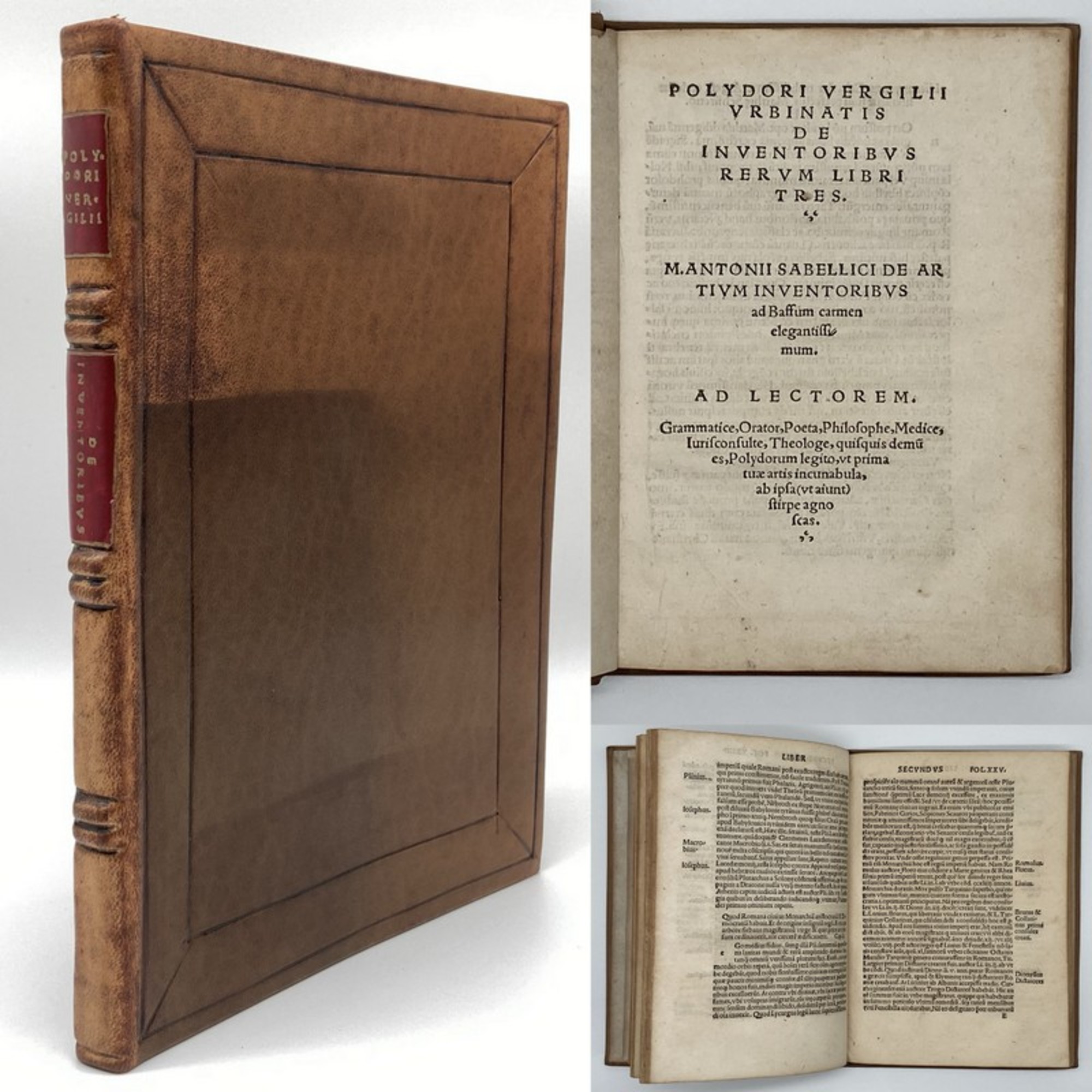 Vergil, Polydor. De inventoribus rerum libri tres. M. Antonii Sabellici de artium inventoribus ad Baffum carmen elegantissimum. Straßburg, Schürer, 1509. 8°, 6 Bl., LXVI num. Bll., neuerer Ldr. im Stil d. Zt. mit RS. Frühe Ausgabe (EA 1499) von Vergils zweitem Hauptwerk, der Abhandlung über die Erfinder aller Dinge in 3 Büchern. Alsbald erweiterte Virgil sein Werk um weitere 5 Bücher, welche erstmals 1521 in Basel bei Froben publiziert wurden. Sein Werk kann als eine Art Kulturgeschichte der Menschheit angesehen werden, denn es beschäftigt sich mit der kulturgeschichlichen Errungenschaften in Bezug auf die zeitliche Abfolge der Erfindungen / Entdeckungen. - Brauner Ganzledereinband auf 3 echten Bünden des wohl späten 19. Jahrhunderts. Vorderer Deckel und Rücken etwas lichtrandig. Papier etwas gebräunt, sehr vereinzelt minimalst braunfleckig. Wenige Seiten schwach feuchtrandig, wenige Seiten mit zarten ANstreichungen und Randnotien von alter Hand. Durchgehend mit winzigem Wurmlöchlein ohne Textverlust, zum Ende hin mit kleinem Wurmgang im unteren weißen Rand. Gutes Exemplar. Bestell-Nr: 3-0-101..........verkauft | ![]() | |