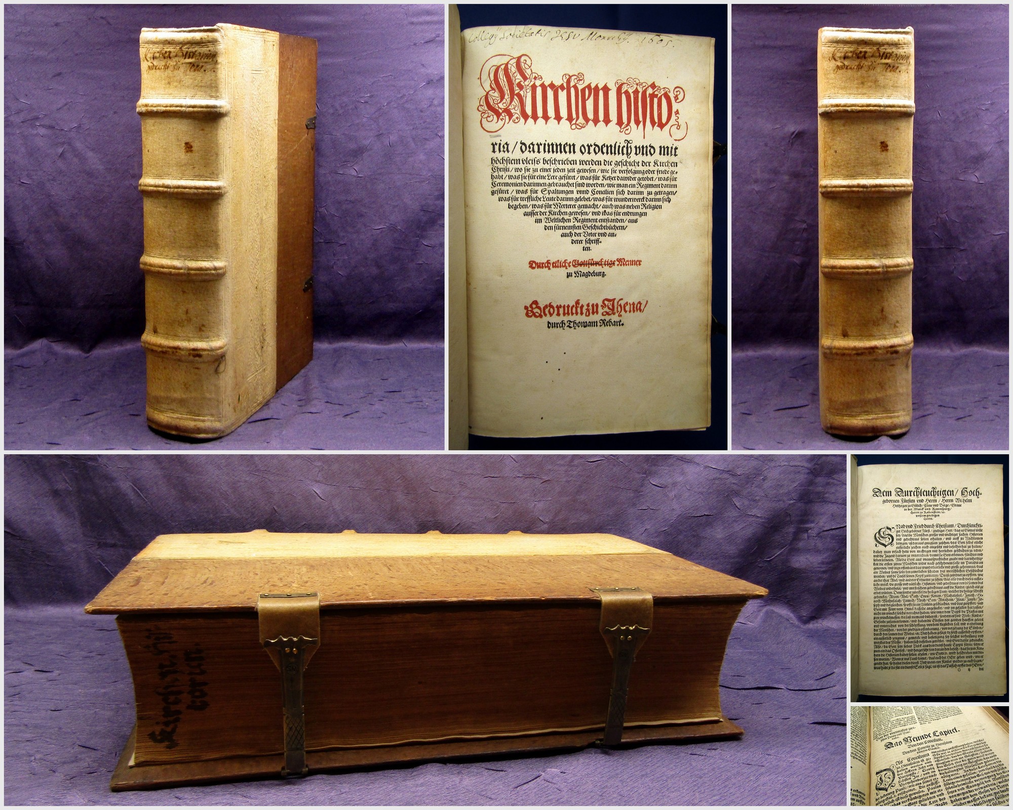 [Magdeburger Centurien] Flacius, Matthias et. al. Kirchenhistoria / darinnen ordentlich und mit höchstem vleiss beschrieben werden die geschicht der Kirchen Christi [...] Durch etliche Gottfürchtige Menner zu Magdeburg [...] 2 Tle in 1 Bd. Jena, Rebart, 1560. Folio (34x22 cm), Titel in Rot und Schwarz, 12 nn. Bll., 784 num. Spalten; 4 nn. Bll., 1222 (recte 1322) Sp., 1 Bll. (Correctur), Halbschweinsleder d. Zt. über Holzdeckeln mit reicher figürlicher und ornamentaler Blindprägung mit 2 erneuerten Schließen im Stil d. Zt. Deutsche EA der ersten großen protestantischen Kirchengeschichte, nach Jahrhunderten eingeteilt. Bei Rebart erschienen nur die Jahrhunderte 1-4. Vorliegend die 1. Centuria in 2 Teilen (Endet mit dem Jahr 97 nach Christi), von Matthias Flaccius initiiert unter Mitwirkung zahlreicher Theologen wie Johannes Wigand und Matthias Richter erstellt. - Einband etwas berieben und gering fleckig. Papier altersbedingt gebräunt, sehr vereinzelt minimal braunfleckig. Titel und Vorsatz mit hs. Besitzvermerken. Sehr gutes Exemplar . Bestell-Nr: 3-0-105..........verkauft | ![]() | |