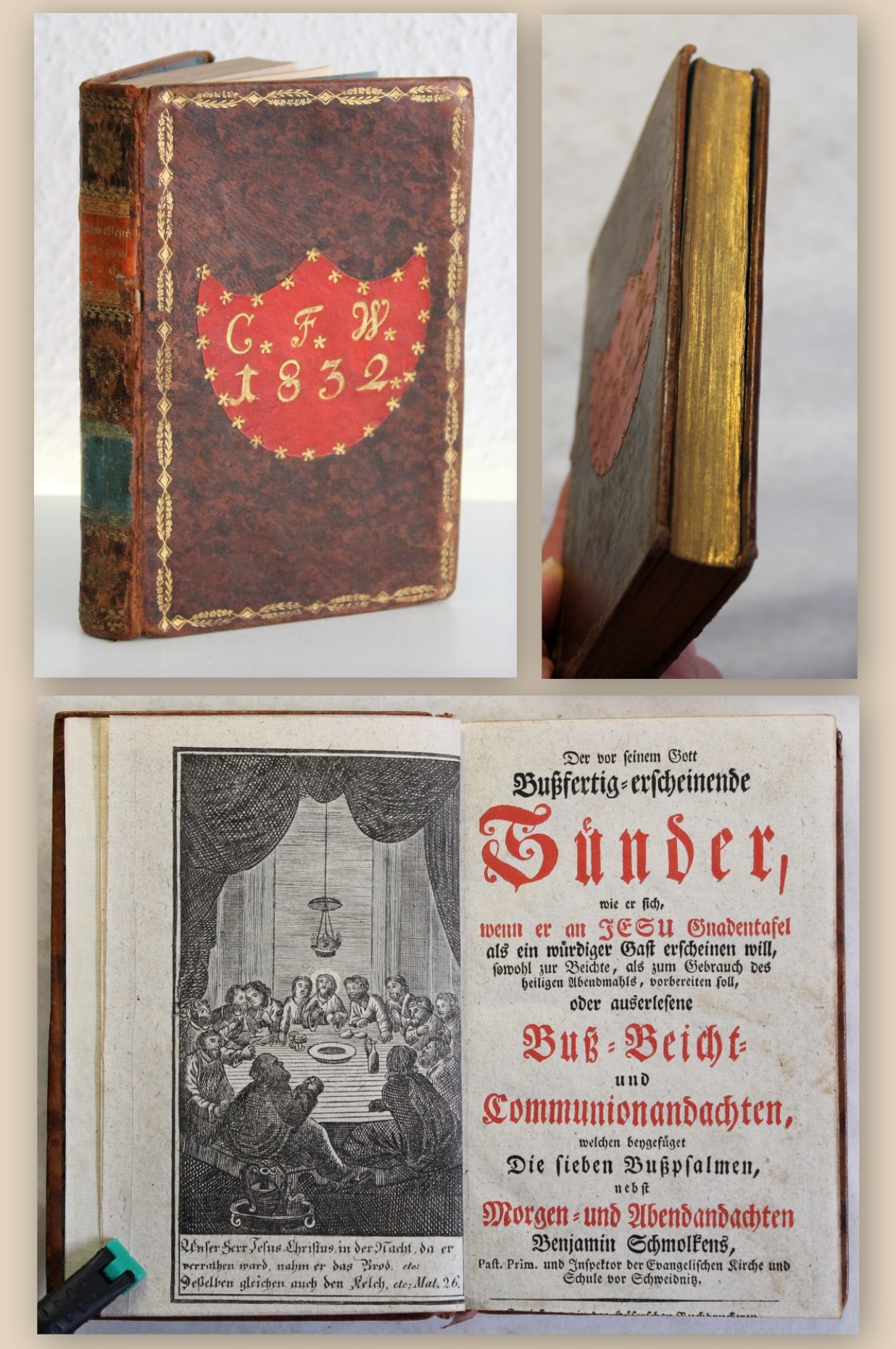 Schmolck, Benjamin. Der vor seinem Gott Bußfertig-erscheinende Sünder, wie er sich wenn er an JESU Gnadentafel als ein würdiger Gast erscheinen will, sowohl zur Beichte als zum Gebrauch des Heiligen Abendmahls, vorbereiten soll, oder auserlesene Buß- Beicht- und Communionandachten, wlchen beigefüt die sieben Bußpsalmen, nebst Morgen- und Abendandachten [...]. Zwickau, Höfer, o. J. (um 1790). 8°, mit gestochenem Frontispiz und zweifarbigem Titel in Rot und Schwarz, VI, 272 S., Ldr. d. Zt. Schöner, goldgeprägter Ganzledereinband mit Monogramm C.F.W. sowie Jahreszahl 1832 auf vorderen Deckel. Einband etwas berieben und bestossen. Papier altersbedingt etwas gebräunt, kaum fleckig. Titel unten knapp beschnitten (Drucker, Ort und Jahr fehlt). Gutes, dekoratives Exemplar. Bestell-Nr: 3-0-11..........verkauft | ![]() | |