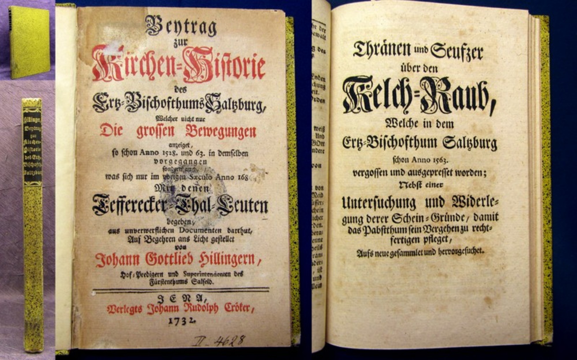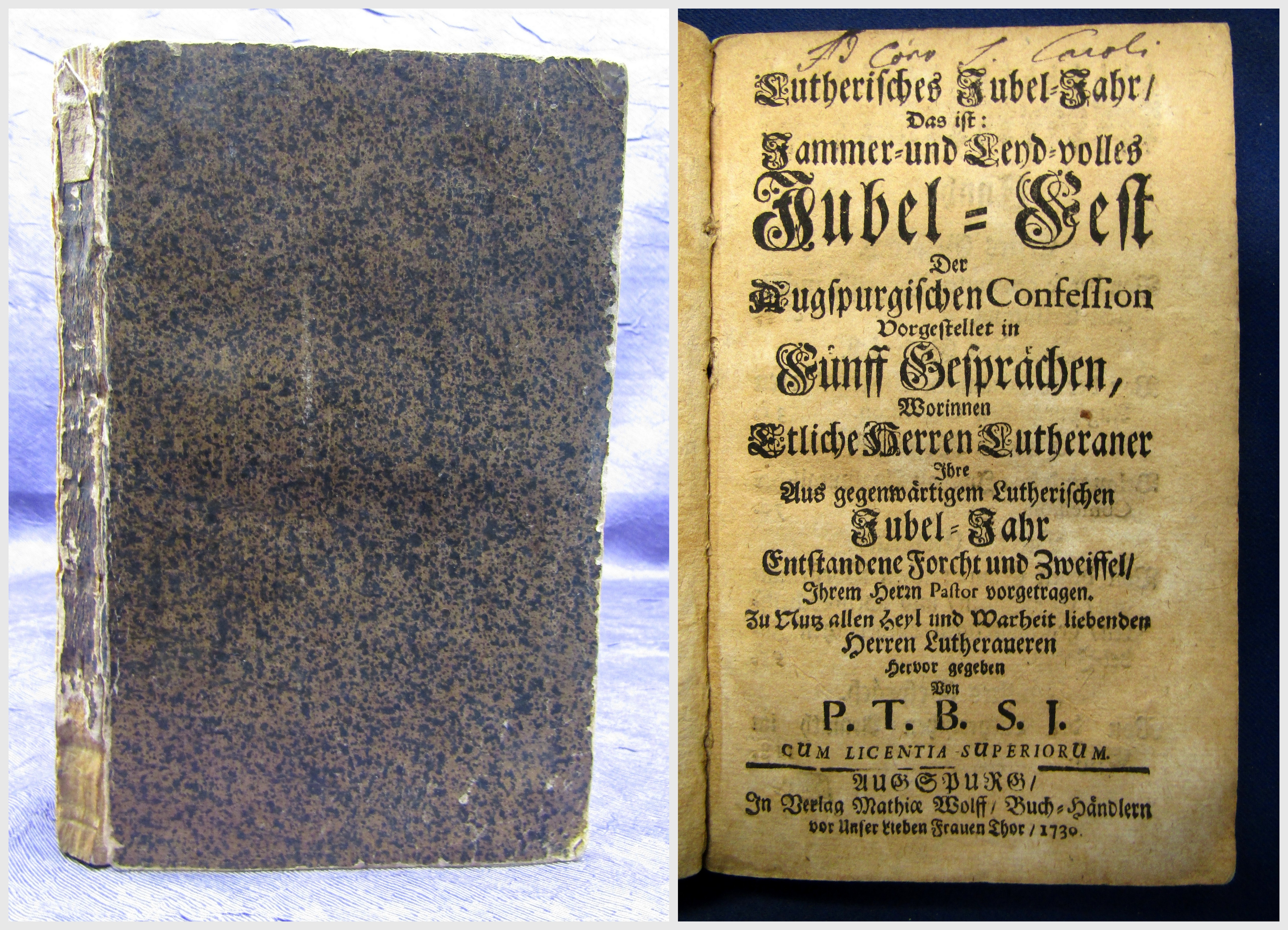P.T.B.S.J. Lutherisches Jubel - Jahr/ Das ist: Jammer- und Lend-volles Jubel-Heft. Der Augspurgischen Confession. Augsburg, Mathia Wolff, 1730. 8°; 139 S.; Pappband. Einband leicht berieben und bestoßen. Titel am oberen rand mit kleinem, alten hs. vermerk. Hinteres Deckel lose. Papierbedingt gebräunt, stellenweise braun-/ fingerfleckig. Gutes Exemplar. Bestell-Nr: 3-0-83..........120,00 € (inkl. MwSt. zzgl. Versand) | ![]() | |