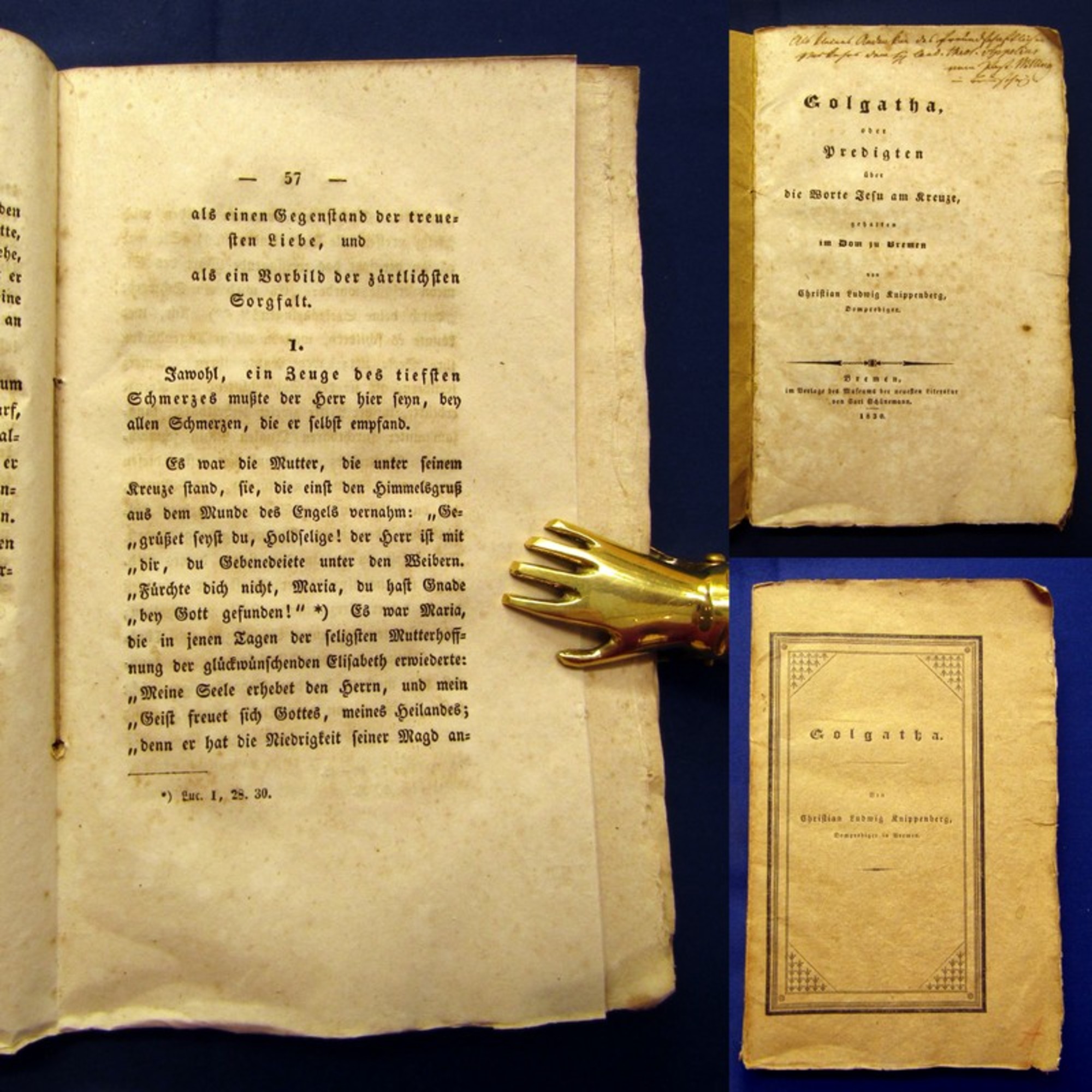Prof. D. Goldhorn. Der verewigte Tzschirner als Kanzelredner, geschildert in einer Rezension der allgemeinen Literaturzeitung.. Halle, von C.A. Schwetschke und Sohn, 1829. 8°(13,5x22,5cm), 38 S., Broschur. besonderer Abdruck mit Beurteilungen Tzschirners Predigten, herausgegeben von Prof. D. Goldhorn, dem Freund und Kollegen des Verewigten, Spiegel mit Blindprägung, Deckel mit kleinen hs. Vermerken, berieben/bestoßen, etwas knickspuriges, seltenes Exemplar . Bestell-Nr: 3-0-115..........120,00 € (inkl. MwSt. zzgl. Versand) | ![]() | |