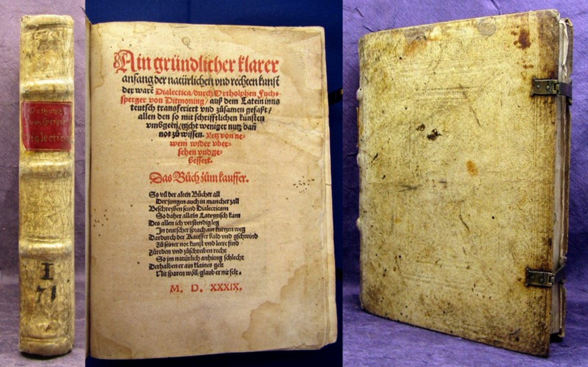Fuchsperger, Ortolf. Ain gründlicher klarer anfang der natürlichen vnd rechten kunst der ware(n) Dialectica ... auß dem Latein inns teutsch transferiert vnd zusamen gefaßt ... Jetz von newem wider ubersehen und gebessert. Augsburg, Weissenhorn, 1539. 8° (21,5x17cm). 8 nn. Bll., 137 num. Bll., 3 nn. Bll., Schweinslederband d. Zt. auf Holzdeckeln mit Schließen. VD 16, F 3269; STC 326; Vgl. ADB 8, S. 174 - Seltene zweite Ausgabe der ersten Dialektik in deutscher Sprache. Wesentlich förderte er den Gebrauch der deutschen Sprache bei Behandlung wissenschaftlicher Gegenstände" (ADB) - Einband etwas fleckig und berieben, kleine Wurmlöchlein. Papier gebraunt, durchgehend wasserrandig (überwiegend in den Außenbereichen), Titel mit restaur. Einriß, bei 2 Bll. obere Ecke ergänzt, teils kl. Wurmspur im Randbereich. Bestell-Nr: 3-0-119..........verkauft | ![]() | |