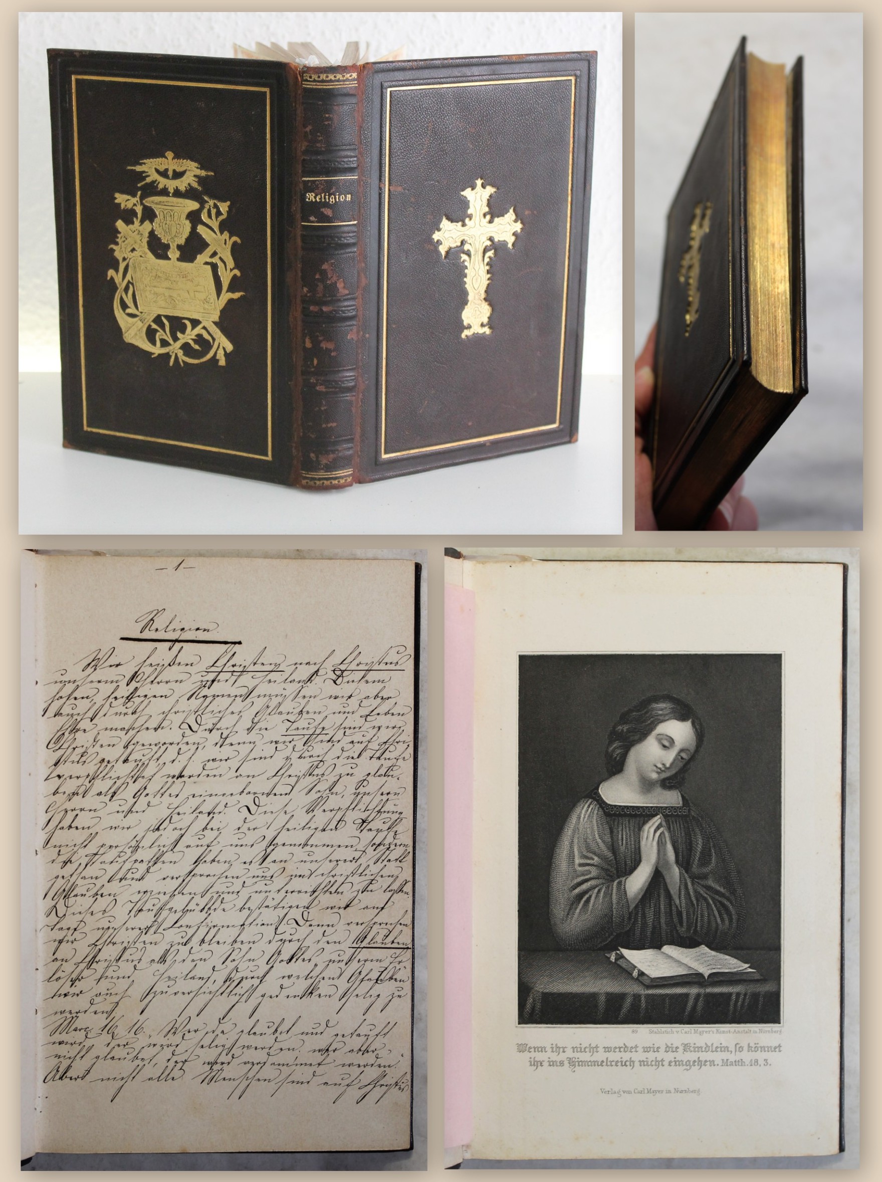 Strombeck, Franziska von. Fünfteilige Handschrift der 17-jährigen Franziska von Strombeck (1855-1931) welche 1892 den deutschen Portrait und Genremaler Georg von Boddien auf Kleinzschachwitz (1850-1926) heiratete. Beinhaltet: 1) Die Relegion, 2) Der Glaube, 3) Das Gebet des Herrn oder Vater unser, 4) Von der heiligen Taufe, 5) Das Sacrament des heiligen Abendmals. Braunschweig, , 1871. 8°, mit gest. Frontispiz, 214 hs. nummerierte Seiten, goldgepr. Ldr. d. Zt. Das vorliegende Werk ist ein schönes Zeugnis der religiösen Verbundenheit und Lehre in der Jugendzeit. Strombeck setzte sich in ihrer Jugend mit wesentlichen Bestandteilen der Relion auseinander und schrieb dies nieder. Einband etwas berieben und bestossen. Papier durchgehend gebräunt. Schönes Exemplar in klar lesbarer Schrift. Bestell-Nr: 3-0-12..........250,00 € (inkl. MwSt. zzgl. Versand) | ![]() | |