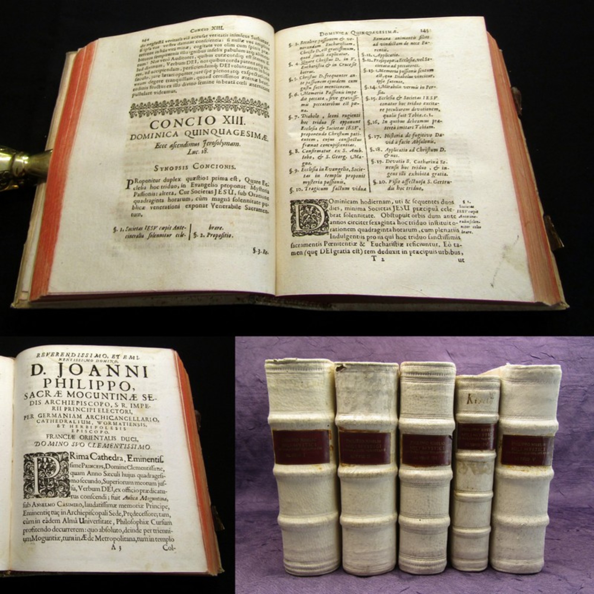 Micheli, Calco di Scichili. Assumpta praedicabilia super omnia quadragesimae Evangelia, hoc est: Sermones morales in singulas totius quadragesimae dominicas et ferias, italice in duas partes conscripti per R.P.M. Michaelem de Calvo...+ Concio XXIII - 2 in 1 Bd. Coloniae Agrippinae, Busaeum, 1659. 8°(21x19cm), Titelvignette, Druckermarke, 7 Bll., 350 S., 22 Bll., 342 S., 50 Bll., Ledereinband mit üppiger Blindprägung. Einband berieben und bestoßen, roter Runumschnitt, hs. Rs., Spiegel erneuert, Titel restauriert (minimaler Textverlust), Papier leicht wasser- und fingerfleckig sowie altersbedingt gebräunt. Bestell-Nr: 3-0-164..........verkauft | ![]() | |