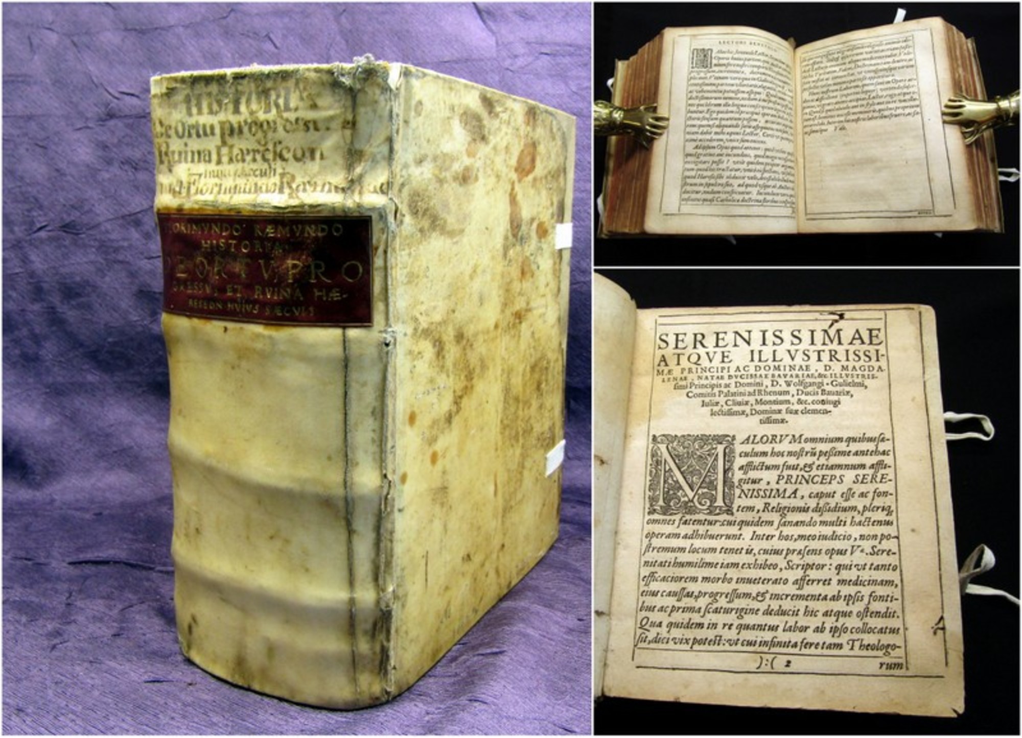 Raemond, Florimond de. Historia de ortu, progressu, et ruina Haereseon hujus saeculi...E Gallicia lingua in Latinam conversa. coloniae, Grevenbruch, 1614. 8°(19x17cm), 3 Bll., 614 S., 639 S., Pergamenteinband mit spanischen Kanten und Buchbändern. Raemundus (1540-1602), ein Parlamentsrat zu Bourbeaur, machte sich zu Ausgang des 16. Jahrhunderts durch seine heftigen Schriften bekannt.In seiner Jugend war er der reformierten Religion zugetan, danach wurde er Katholik. - Einband berieben, bestoßen und wasserfleckig, hs. Rs., Buchbänder neuerer Zt., hinterer Vorsatz wasserfleckig, Papier mit hs. Vermerken, wurmspurig, teilw.restauriert (ohne Textverlust) und altersbedingt gebräunt, roter Rundumschnitt . Bestell-Nr: 3-0-135..........verkauft | ![]() | |