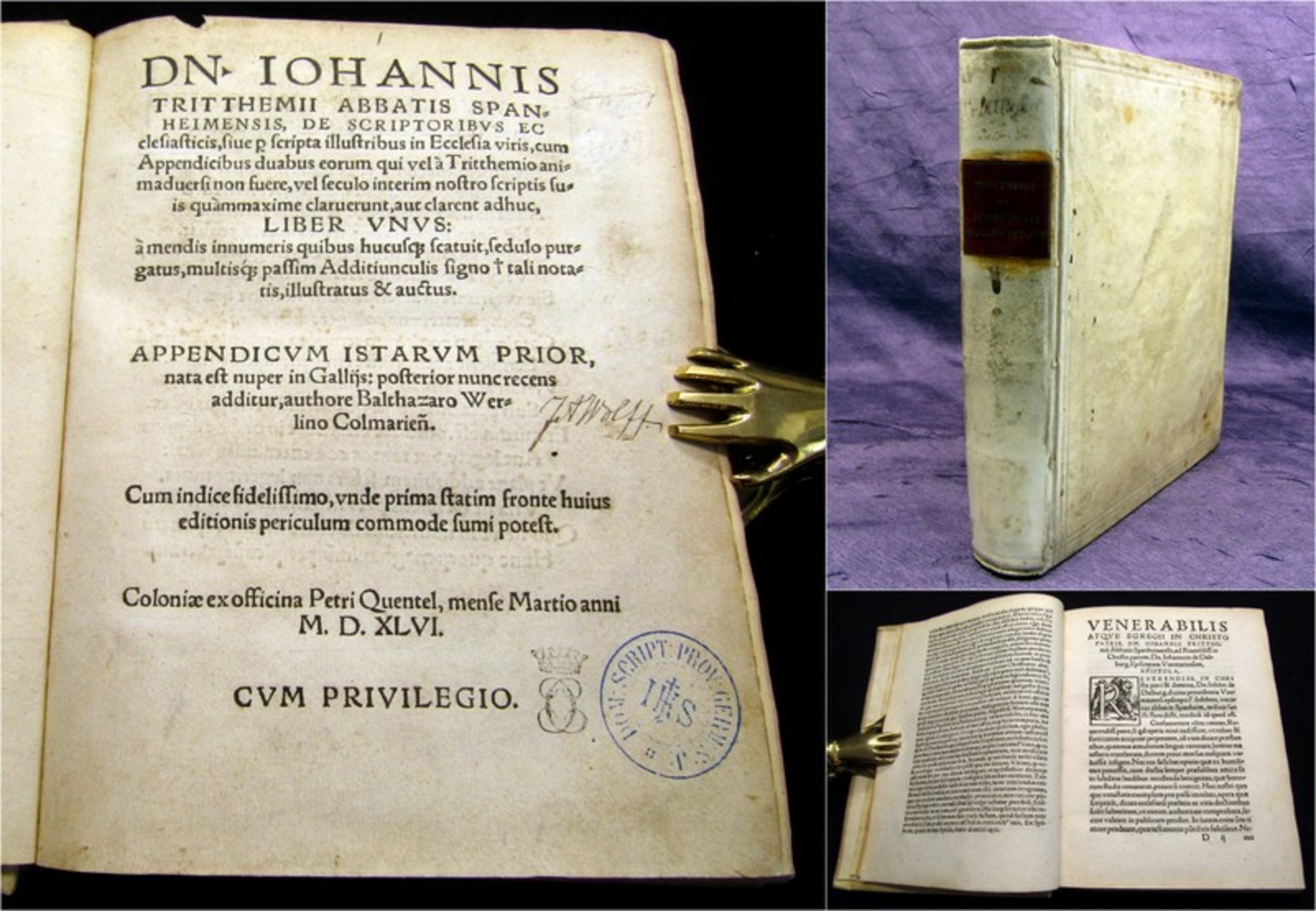Trithemius, Johnnes / Werlin, Balthasar. De scriporibus ecclesiasticis...cum Appendicibus duabus.... Coloniae, Quentel, 1546. 8° (21x17cm), Bibliotheksstempel auf Titel, 16 Bll., 494 S., Pergamenteinband mit Blindprägung. Johannes Trithemius, latinisiert aus Johann Tritheim, auch Johannes von Trittenheim, Johann Heidenberg sowie Johannes Zeller genannt, war ein deutscher Mönch, Abt der Benediktinerabtei Sponheim und ab 1506 vom Schottenkloster Würzburg, vielseitiger Gelehrter und Humanist. - Einband berieben und bestoßen, hs. Rs., Blindprägung auf Deckel, hs. Vermerke, Papier altersbedingt gebräunt. Bestell-Nr: 3-0-138..........verkauft | ![]() | |