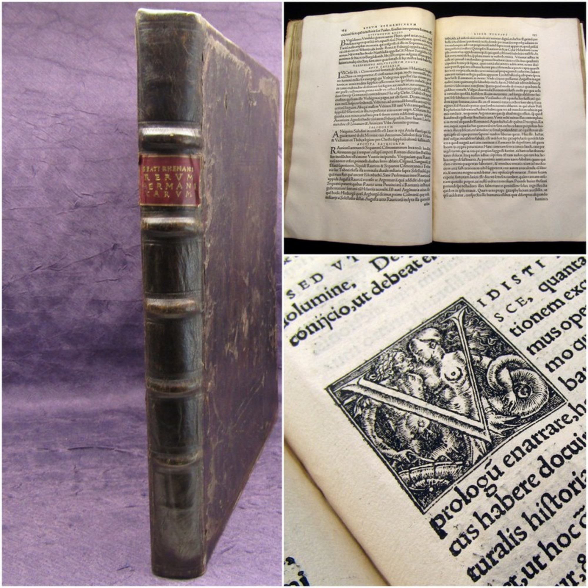 Froben. Beati Rhenani - selestadiensis rerum Germani carum libri tres, 2 Postinkunabeln in 1 Bd.. Basel, Martio, 1526/1531. 4°(31x21cm), mit einigen schönen Holzschnittinitialien, I: 193 (v.194) S., 1 Bl., Titel fehlt (Titel auf altem Papier in Faksimile eingebunden), II: 110 S., Ledereinband d. Zt. - Einband unter Verwendung der alten Deckelbezüge restauriert, berieben und bestoßen, Papier stellenw. knickspurig, wasserrandig und altersbedingt gebräunt. Bestell-Nr: 3-0-140..........950,00 € (inkl. MwSt. zzgl. Versand) | ![]() | |