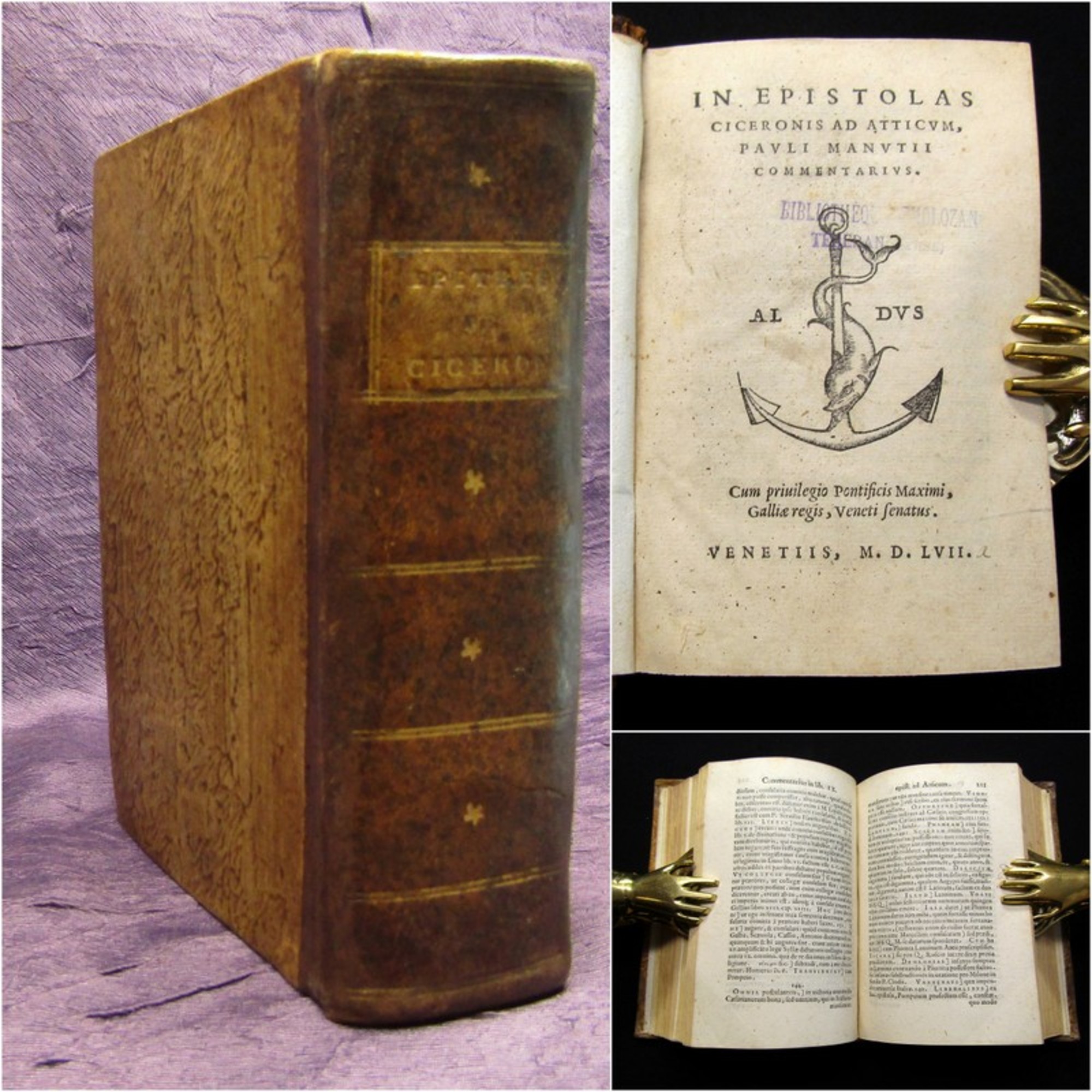 Ciceron, Marcus Tullius Cicero u. Manuzio, Paolo. In Espistolas Ciceronis Ad Atticum, Pauli Manutii Commentarius. Venetiis, Aldus, 1557. 12°(15x10cm), späte Aldine auf Titel, 400 S., Halbledereinband. Cicero, 106-43 v. Chr., aus Arpinum südostwärts von Rom, der Vollender der latainischen literarischen Prosa und Schöpfer ihrer klassischen Form. Sein uns fast vollständig erhaltenes Werk gliedert sich in mehrere Abteilungen: 1) Poetische Versuche und metrische Übersetzungen 2) Reden 3)rhetorische Schriften 4) philosophische Schriften 5) Briefe - Einband leicht berieben und bestoßen, Rs. mit Goldprägung, roter Rundumschnitt, stellenw. hs. Vermerke, Papier altersbedingt gebräunt und teils braunfleckig. Bestell-Nr: 3-0-144..........verkauft | ![]() | |