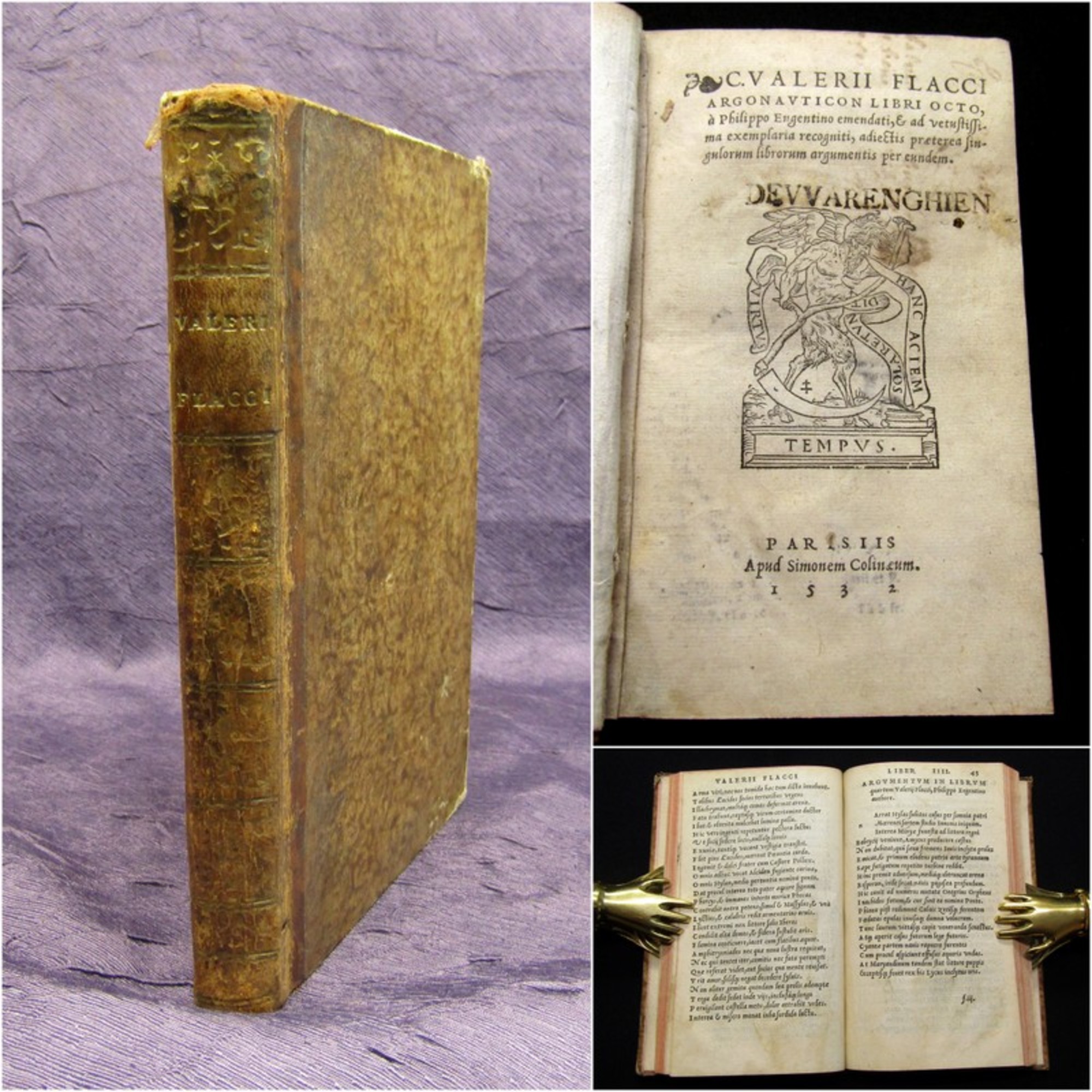 Flaccus, Valerius. Argonauticon libri octo, Philippo Engentino emendati, et ad vetustissima exemplaria. Paris, Colineum, 1532. kl 8°(16x10,5cm), 103 Bll., Pappeinband. Engentinus, (Philippus), ein Lehrer der Dichtkunst zu Wittenberg, in der letzten Hälfte des 16. Jhrhd. - Einband berieben und bestoßen, Rücken mit Goldprägung, Ecken stärker bestoßen, roter Rundumschnitt, Papier altersbedingt gebräunt. Bestell-Nr: 3-0-146..........verkauft | ![]() | |