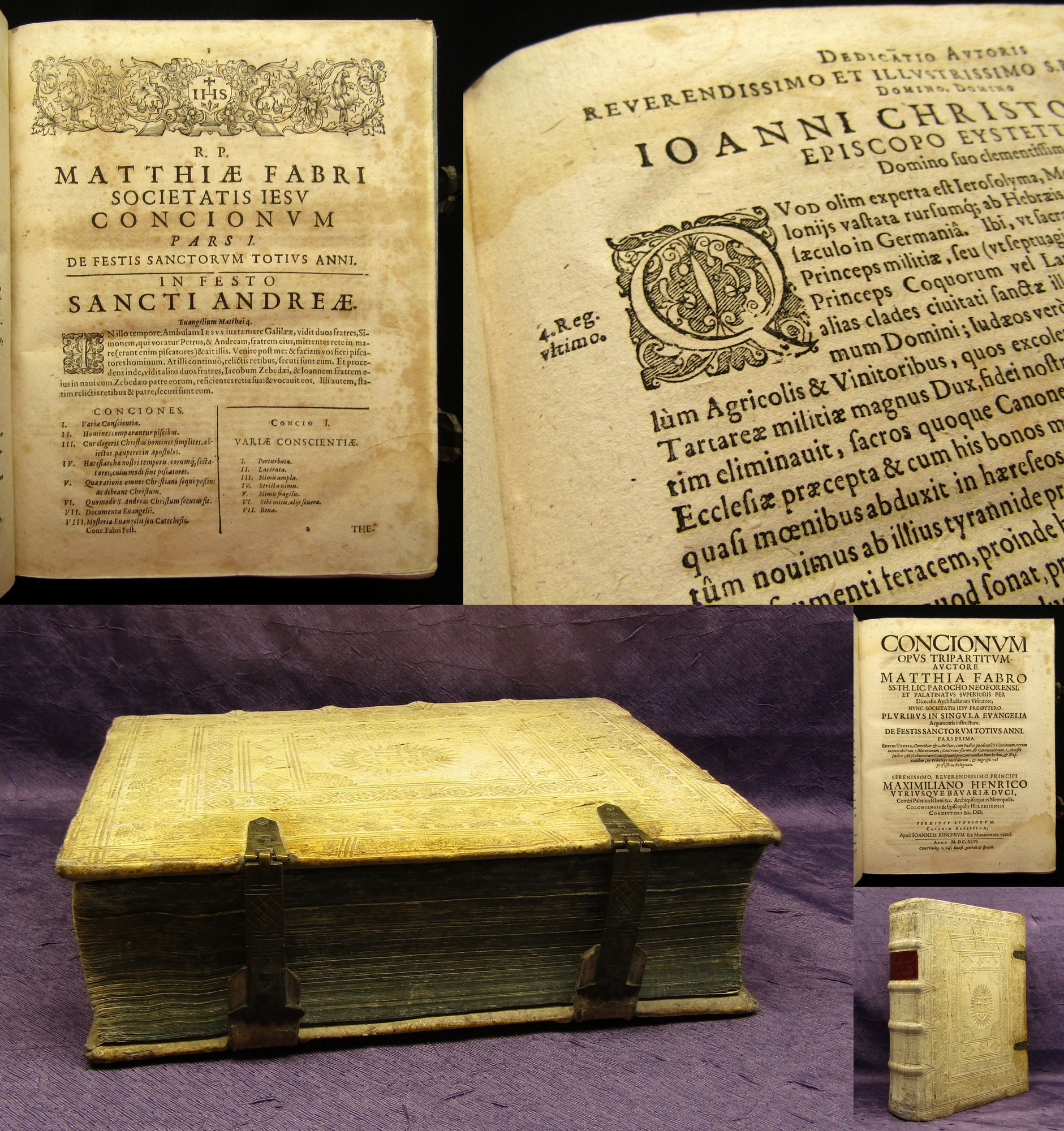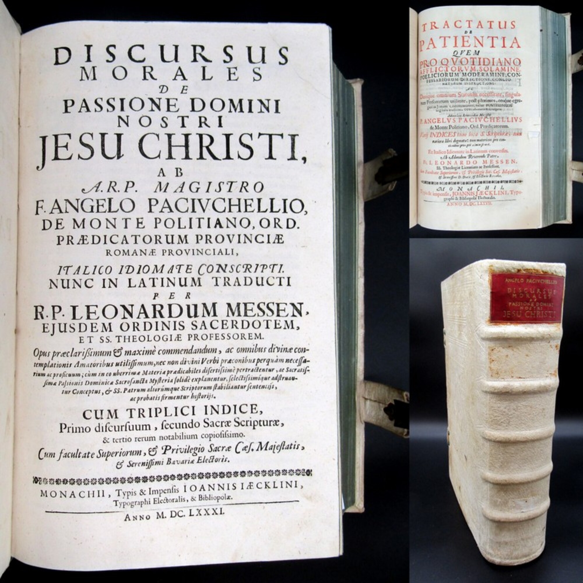 Paciuchelli, Angelo. Discursus morales de passione domini nostri Jesu Christi; Tractatus de Patientia quem pro Quotidiano Afflictorum solamine - 2 in 1. Monachii, Typis & Impensis Ioannis Iaecklini, 1681; 1677. 4°(34x23cm), alte Druckermarken, 8 Bll., 608 S., 6 Bll.(Index), 4 Bll., 408 S., 15 Bll.(Index), Pergamenteinband mit Messingschließen. Einband berieben und bestoßen, blauer Rundumschnitt, Fehlstelle im 2. Titelblatt (ohne Textverlust, Papier altersbedingt gebräunt und minimal braunfleckig. Bestell-Nr: 3-0-206..........verkauft | ![]() | |