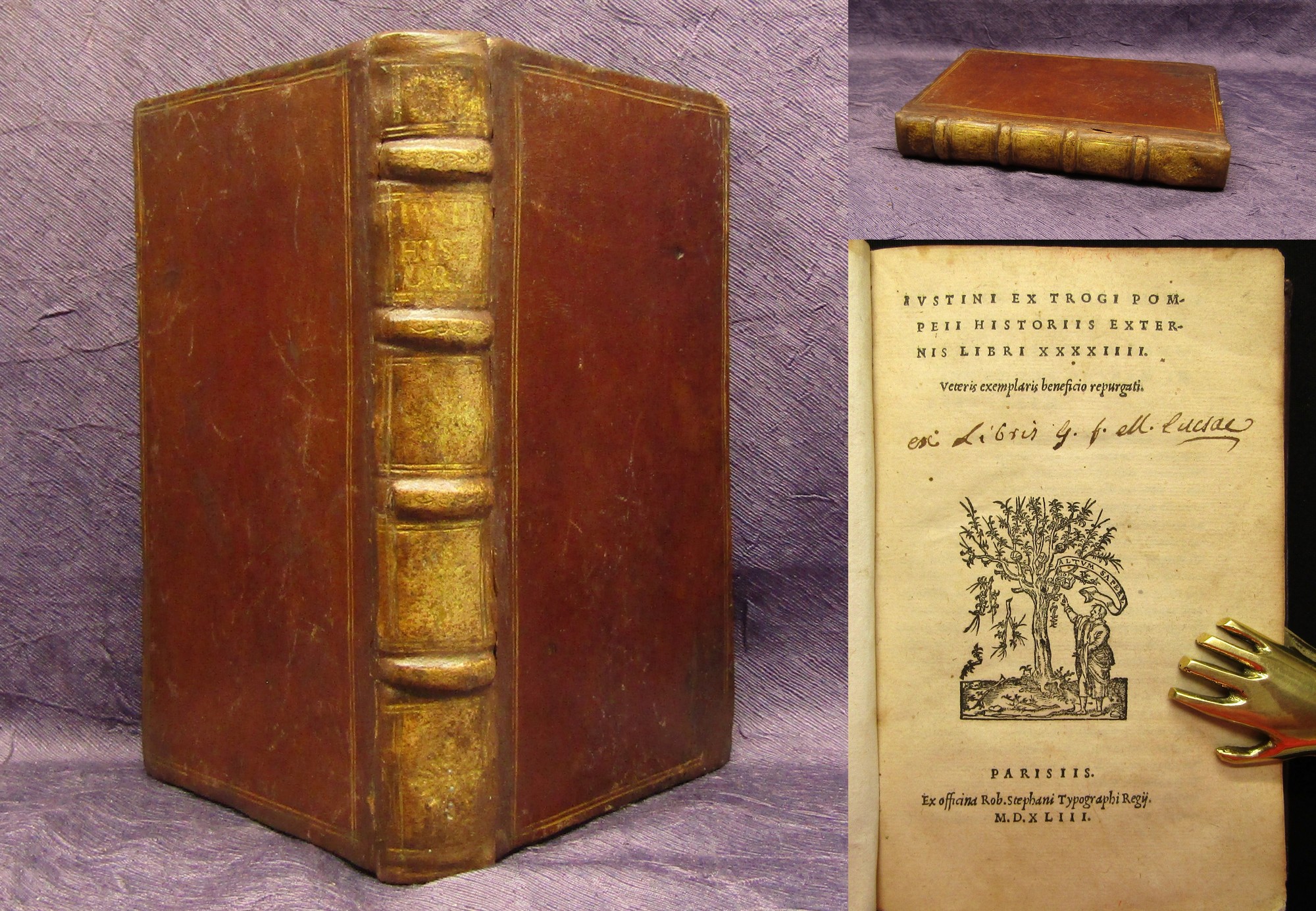 Aemilius, P. (Emili, Paolo). Pauli Aemylii Veronensis, historici clarissimi, de rebus gestis Francorum, ad christianissimum [...] libri decem. Paris, M. Vascosanus sibi, & J. Roigny, 1544. Folio (34x24cm), mit einigen teils wiederh. herrlichen, figürlichen / floralen Holzschnittinitialen, 5 nn. Bll., 244 Bll., 20 nn. Bll.(Index); 28 nn. Bll. (Chronicon), Ldr. d. Zt. Enthält die Geschichte Frankreichs im 15. Jahrhundert von dem italienischen Historiker Paolo Emilio da Verona (1455-1529). - Einband nahezu perfekt unter Verwendung der alten Deckelbezüge restauriert. Über 6 echten Bünden mit Streicheisenlinien, goldgeprägten Mittelstücken und goldgepr. Eckfleurons. Vorsätze und Spiegel erneuert. Papier etwas gebräunt, kaum fleckig, Titel mit kleinem EInriss unten im weißen Rand, erste 2 Blatt mit geraden Einschnitten ohne Textberührung. Bestell-Nr: 3-0-110..........zurückgestellt | ||