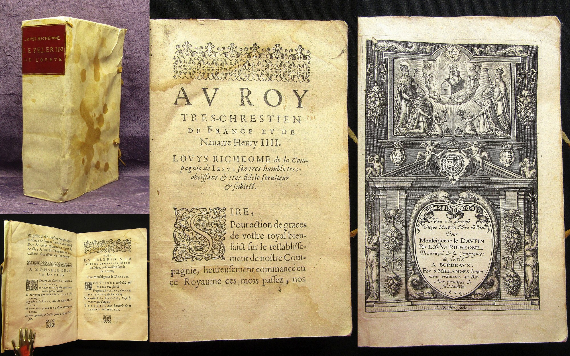 Richeome, Luis. Le pelerin de Lorete . Bordeaux, impr. de S. Millange, 1604. kl 8(17x12cm), gestochener Kupfertitel, 11 Kupfertafeln v. Gaultier, 8 Bll., 983 S., 9 Bll., Ledereinband mit spanischen Kanten und Buchbändern. Jöcher erg. VI/2039 - Louis Richeôme SJ war ein französischer Jesuit, christlicher Humanist und Schriftsteller.Léonard Gaultier oder, wie er sich manchmal selbst bezeichnet, Galter, ein französischer Kupferstecher, wurde um 1561 in Mainz geboren und starb 1641 in Paris. Sein Arbeitsstil ähnelt dem von Wierix und Crispyn van de Passe.- Einband stark brieben, bestoßen und fleckig, Papier wurmspurig, im hinteren teil stark braumfleckig, sonst altersbedingt gebräunt. Bestell-Nr: 3-0-151..........verkauft | ![]() | |