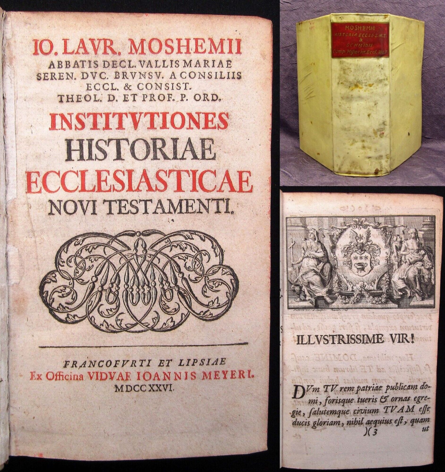 Mosheim, Johann Lorenz. Institutiones Historiae Ecclesiasticae, Novi Testamenti + Compendium Historiae Ecclesiasticae Veteris Testamenti - 2 Bde. in 1. Frankfurt, Jena; Helmstedt, Meyer; Melch, 1726; 1718. kl 8(17,5x11cm), 11 Bll., 718 S.; 3 Bll., 32 S., 224 S, 27 Bll. (Index), Pergamenteinband. Jöcher IV 294-297 - Johann Lorenz Mosheim, ab 1748 von Mosheim, war ein deutscher lutherischer Theologe und Kirchenhistoriker. - Einband berieben, bestoßen und angeschmutzt, hs. Rs., roter Rundumschnitt, Spiegel mit hs. Vermerken, Titel restauriert, Papier alersbedingt gebräunt uns fingerfleckig. Bestell-Nr: 3-0-159..........verkauft | ![]() | |