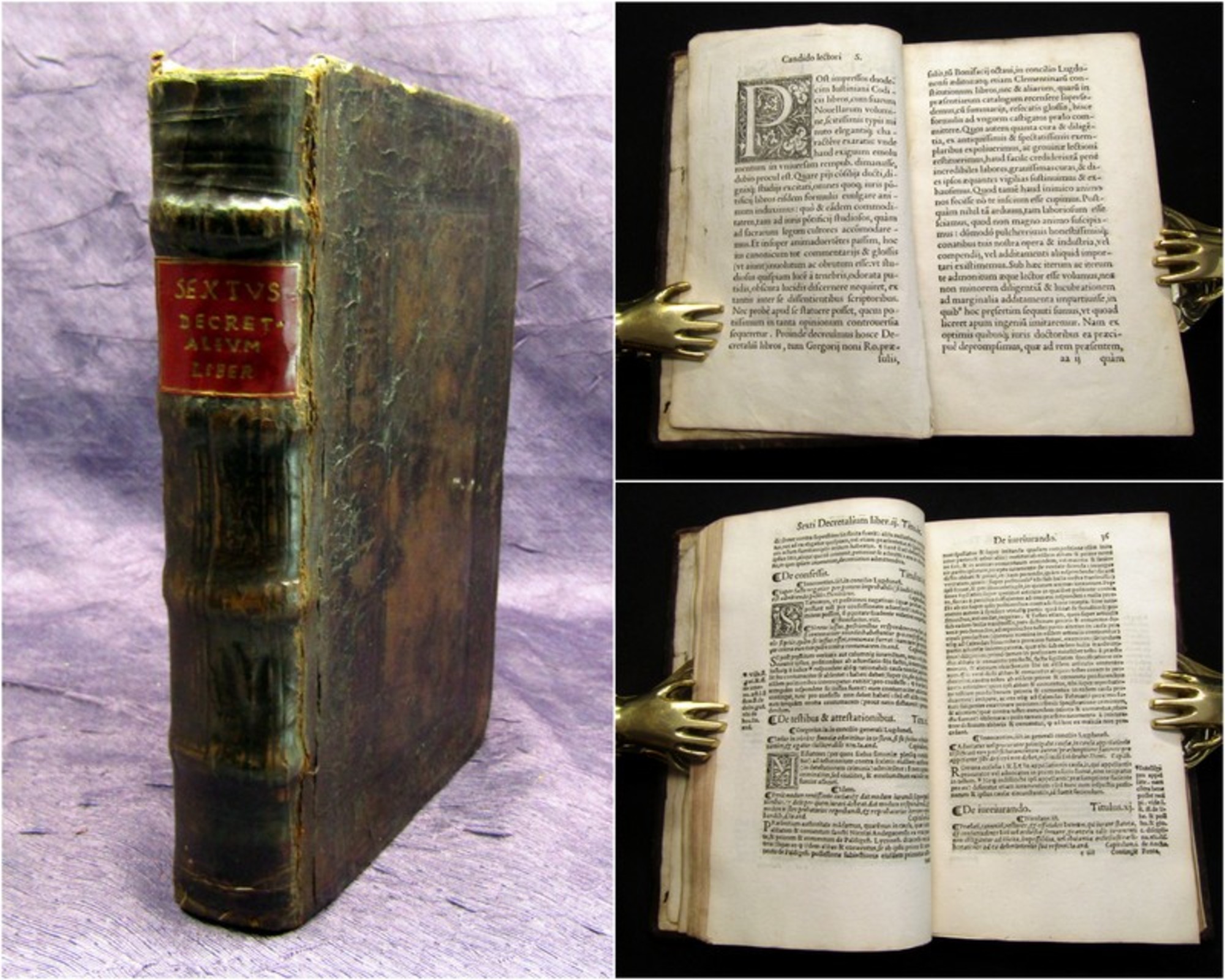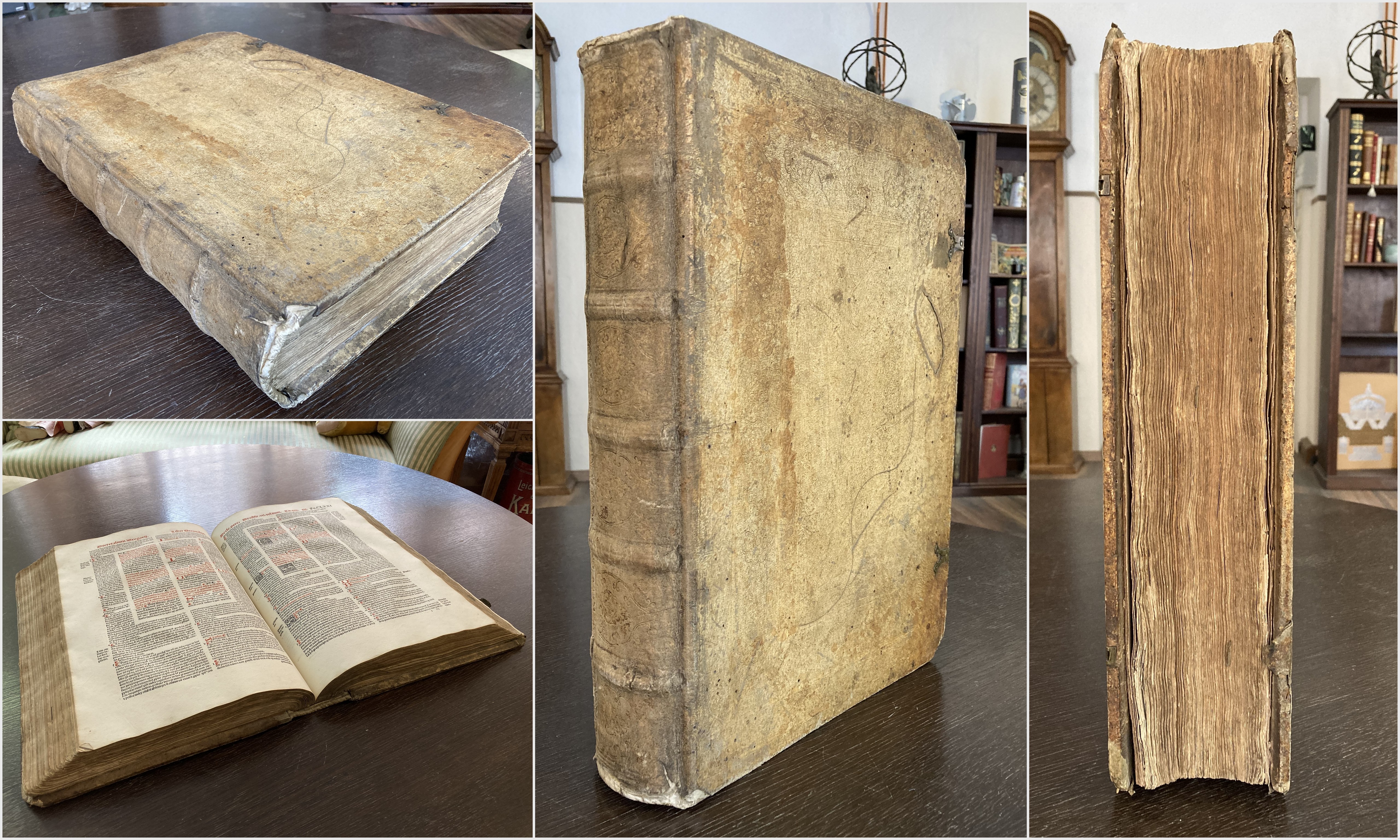 Papst Gregor IX. Decretalium domini pape Gregorij noni libellus accurata diligentia emendatus: summoq[ue] studio elaboratus: cum multiplicibus tabulis et repertorijs ad materias quacu[n]q[ue] diligenter inueniendas aptis. Lugdunium, Nicolas de Benedictis, 1508. Folio, mit 4 (3 fast blattgroßen) Textholzschnitten, zahlreichen Holzschnittinitialen und Holzschnittdruckermarke - Text zweifarbig und zweispaltig, 2 Bll., 337 num. Bll., 31 Bll., blindgepr. Schweinsleder d. Zt. BSB - 2 J.can.f. 49-2 - Wohl zweite Ausgabe der Decretalia Papst Gregors IX. (1145-1241) im 16. Jahrhundert, eine Postinkunabel von großer Seltenheit, gedruckt von dem Lyonneser Drucker Nicolas de Benedictis. Die Decretales Gregorii IX, das sogenannte Liber extra des Papstes Gregor IX. (1145-1241) gehört zu den umfangreichsten Sammlungen von Erlassen in Urkundenform mit Antworten und Entscheidungen des Papstes Rechtsfragen innerhalb der päpstlichen Jurisdiktionsgewalt. Die Decretalen wurden im Laufe der Zeit zu Normierungen, die sich bis zum 14. Jahrhundert zu wesentlichen Bestandteilen des kanonischen Rechts entwickelten. - Einband berieben, bestoßen, angeschmutzt, 3 Ecken abgebrochen, Kapitale repariert, Schließen nur fragmentarisch erhalten. Papier durchgehend etwas gebräunt, teils mit kleinen Wurmlöchlein, zu Beginn und Ende stärker. Innen wenig fleckig, sehr vereinzelt minimalst feuchtrandig. Erste Blatt etwas stärker, gebräunt, teils repariert, Vorsätze und Spiegel laienhaft erneuert. Vereinzelt hs. Randanmerkungen. 1. Blatt und Blatt 337 mit kleinem Loch, dadurch geringer Buchstaben- / Textverlust. Wenige Blatt mit kleinen Ein-/Ausrissen im weißen Rand. Gutes Exemplar. Bestell-Nr: 3-0-82..........verkauft | ![]() | |