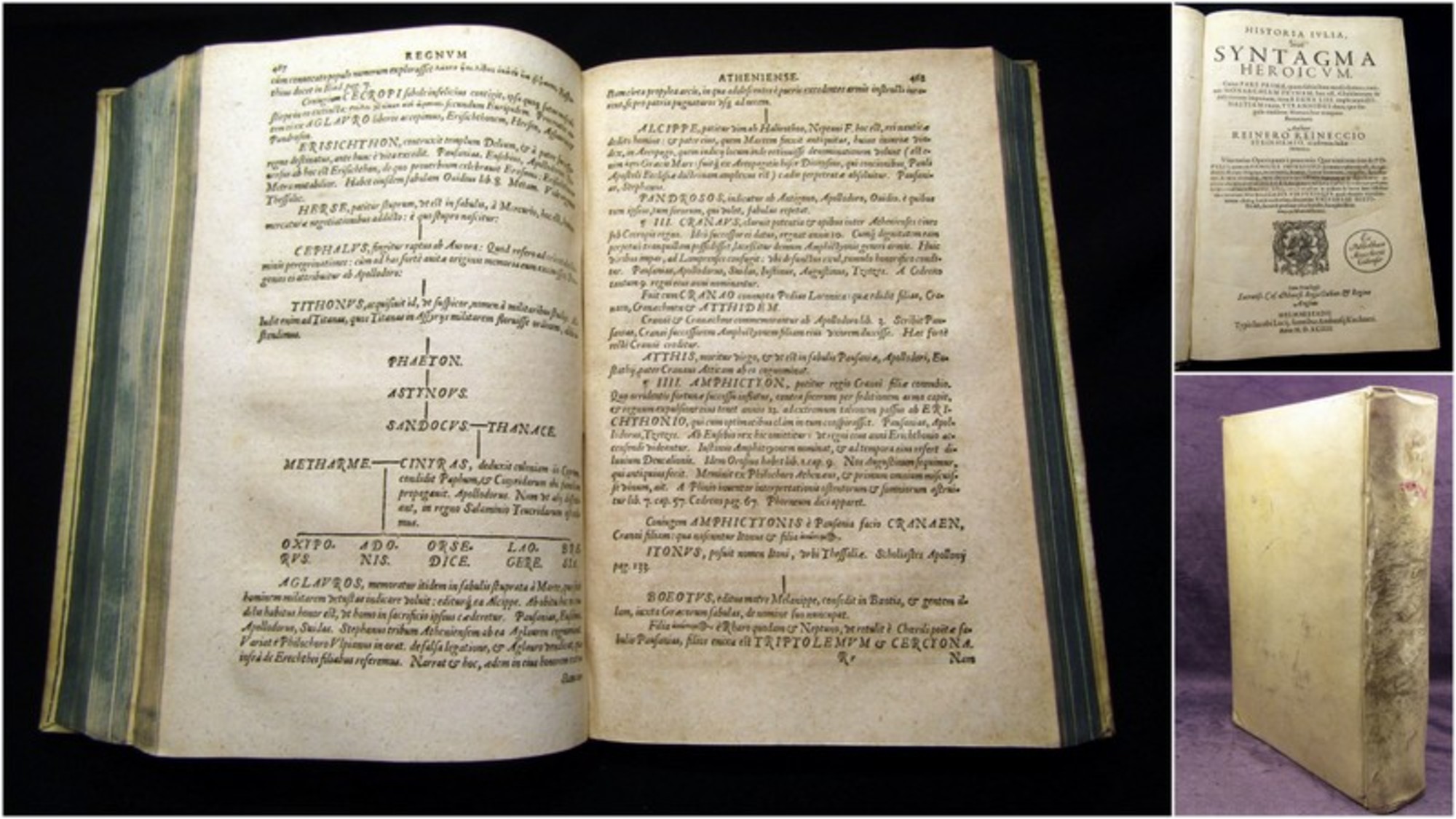 Reineccius, Reiner. Historia Ivlia, Siue Syntagma Heroicvm. 1, Cuius Pars ..., quam subiectam modò damus, continet Monarchiam Primam, hoc est, Chaldaeorum & Assyriorum imperium : item Regna LIII. implicatam Dynastiam vnam, Tyrannides duas; quae singula eiusdem Monarchiae tempore floruerunt . Magdeburg, Kirchnerus, 1594. 4°(30x21cm), Titelvignette, alter Bibliotheksstempel, mit zahlr. dplblgr. Stammtaf. u. einigen Textholzschn. (Münzen), 16 Bll., 644 S., 12 Bll. (Index), 97 S., Pergamenteinband. VD 16, R 886. Brunet IV, 1198 f. Jöcher III, 1988 - Abstammungsgeschichte sämtlicher Könige und Herrscher in Europa und Vorderasien aus mythologischer u. geschichtlicher Zeit. - Erweiterte Neubearbeitung der früher erschienenen 'Syntagma'. - Einband berieben und bstoßen, Rücken stärker berieben mit 2 Fehlstellen, blauer Rundumschnitt, Spiegel mit hs. Vermerken, Papier altersbedingt gebräunt. Bestell-Nr: 3-0-171..........verkauft | ![]() | |