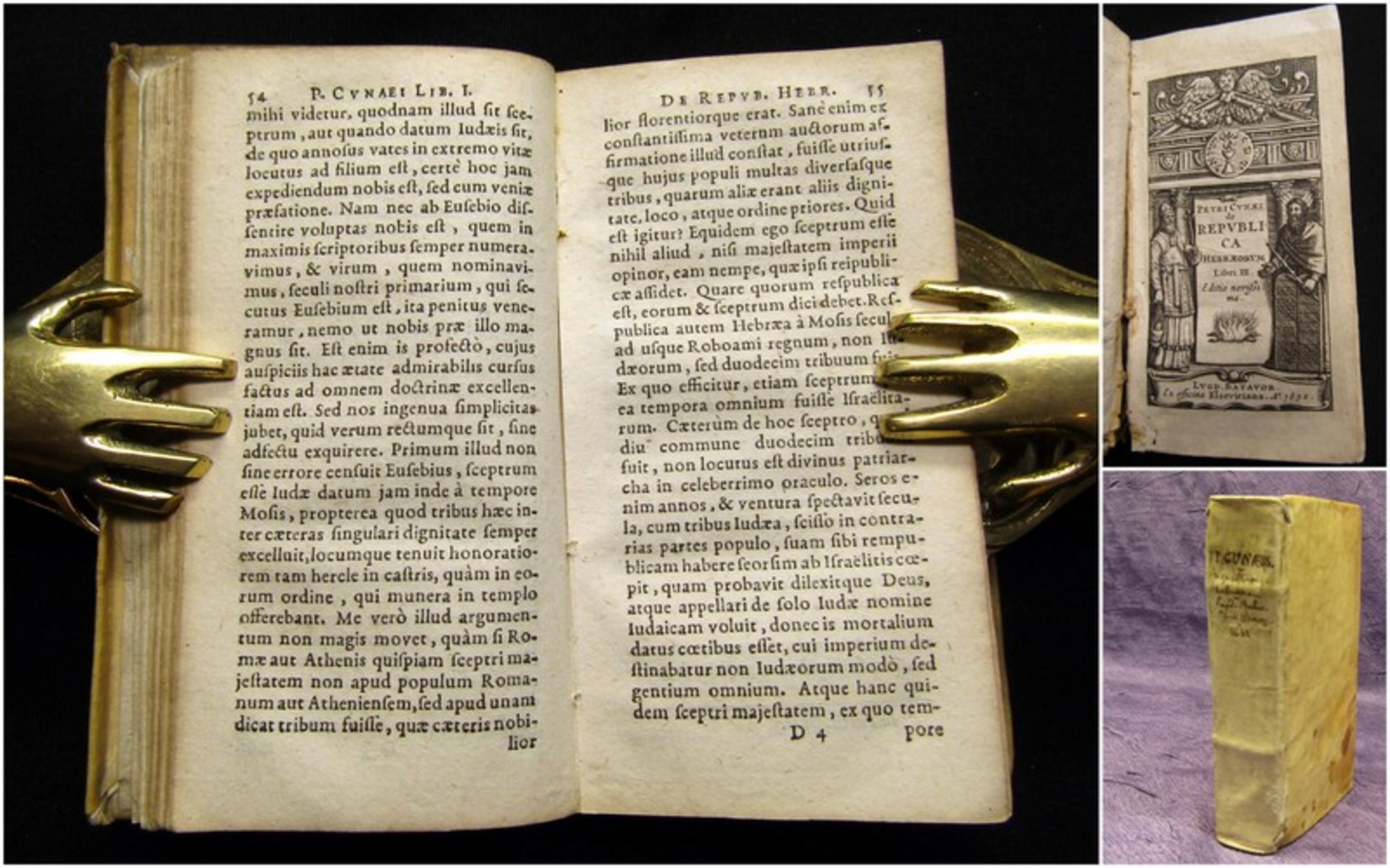 Cunaeus, Petrus. Petri Cunaei de Republica Hebaeorum : Libri III. Leiden, Elzeviriana, 1632. 12°(11x6cm), gestochener Titel, 15 Bll., 371 S., Pergamenteinband mit spanischen Kanten. Cunaeus war der Sohn des Kaufmanns Adrian Cunaeus. Er erhielt seine erste Ausbildung in Middelburg und ließ sich als Jugendlicher am 23. Mai 1601 in die Matrikel der Universität Leiden einschreiben. Hier studierte er unter Anleitung eines Verwandten mütterlicherseits, Ambrosius Regemorteus, alte Literatur, Griechische und Hebräische Sprache. 1603 unterbrach er seine Studien und reiste nach England. - Einband berieben, bestoßen und stellenw. fleckig, Rücken hs. beschrieben (Titel), Bindung leicht gelöst, Spiegel mit hs. Vermerken, leicht wurmspurig auf den ersten Seiten, hinterer Spiegel leicht vom Deckel gelöst, Papier altersbedingt gebräunt. Bestell-Nr: 3-0-174..........340,00 € (inkl. MwSt. zzgl. Versand) | ![]() | |