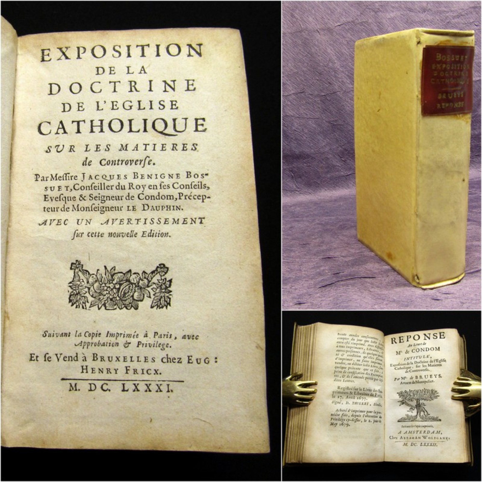 Bossuet, Jacques Benigne. Exposition de la Doctrine de Leglise Catholique sur les Matieres de Controverse - 2 in 1 Bd.. Brüssel, Henriy Fricx, 1681. 12°(14x8cm), Titelvignette, 100 S., 264 S., Pergamenteinband d. Zt. mit spanischen Kanten. Einband berieben und bestoßen, rotes hs. Rs., Spiegel und Vorsatz mit hs. Vermerken, Papier altersbedingt gebräunt. Bestell-Nr: 3-0-175..........250,00 € (inkl. MwSt. zzgl. Versand) | ![]() | |