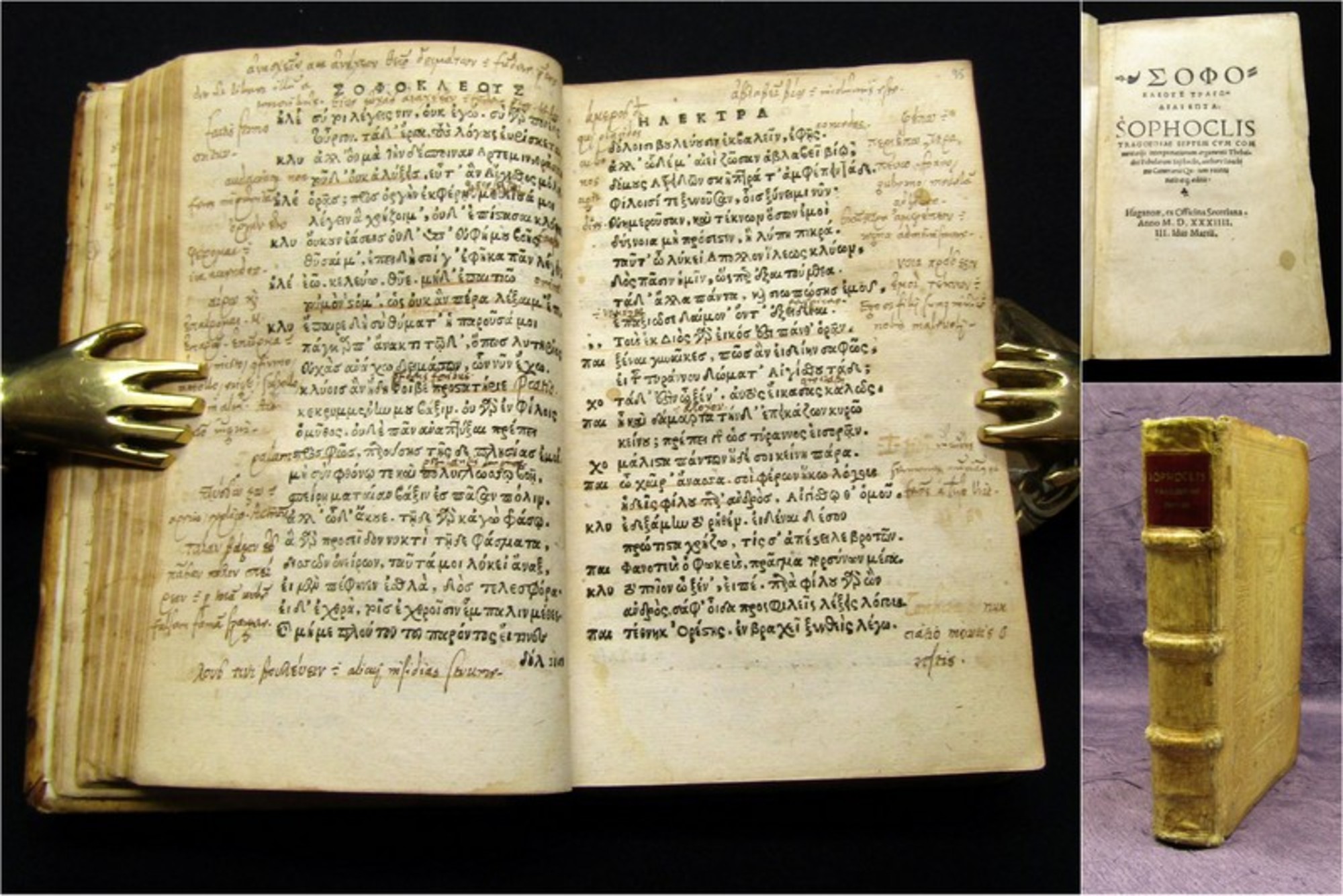 Sophokles. Sophokleus Tragödiai epta [...] Sophoclis Tragoediae Septem cum Commentarijs [...] Teil 1(v.2). Haganoae [Hagenau], Officina Seceriana [Johannes Setzer], 1534. kl 8°(16x11cm), mit Holzschnittinitiale und Holzschnittdruckermarke, 228 nn. Bll. (Lagen A-EE mit je 8 Bll, FF mit 4 Blatt), reichhaltig blindgeprägter Schweinsledereinband auf 3 Bünden mit neuerem Rückenschild. Sophokles war ein Dichter in der Zeit der Griechischen Klassik. Er gilt neben Aischylos und Euripides als der bedeutendste der antiken griechischen Tragödiendichter. Seine erhaltenen Stücke, vor allem Antigone und König Ödipus, werden auf den Bühnen der ganzen Welt gespielt. - Einband berieben und bestoßen, Kapitale etwas angegriffen, Gelenke gering brüchig, Schließen entfernt. Papier altersbedingt gebräunt und teils feuchtrandig, 2 Seiten mit stärkerer bräunlicher Verfärbung, letzte 3 Blatt mit kleinem Wurmloch in unterem weißen Rand, Vorsätze erneuert, Schnitt angeschmutzt, Spiegel mit hs. Vermerken, zahlreiche Blätter umfangreichen Randnotizen von alter Hand, Seitenzahlen hs. (teils fehlerhaft) paginiert. Hauptwerk ohne den meist angebundenen, im Titel erwähnten, Kommentar, welcher den Teil 2 des Werkes bildet. Bestell-Nr: 3-0-177..........verkauft | ![]() | |