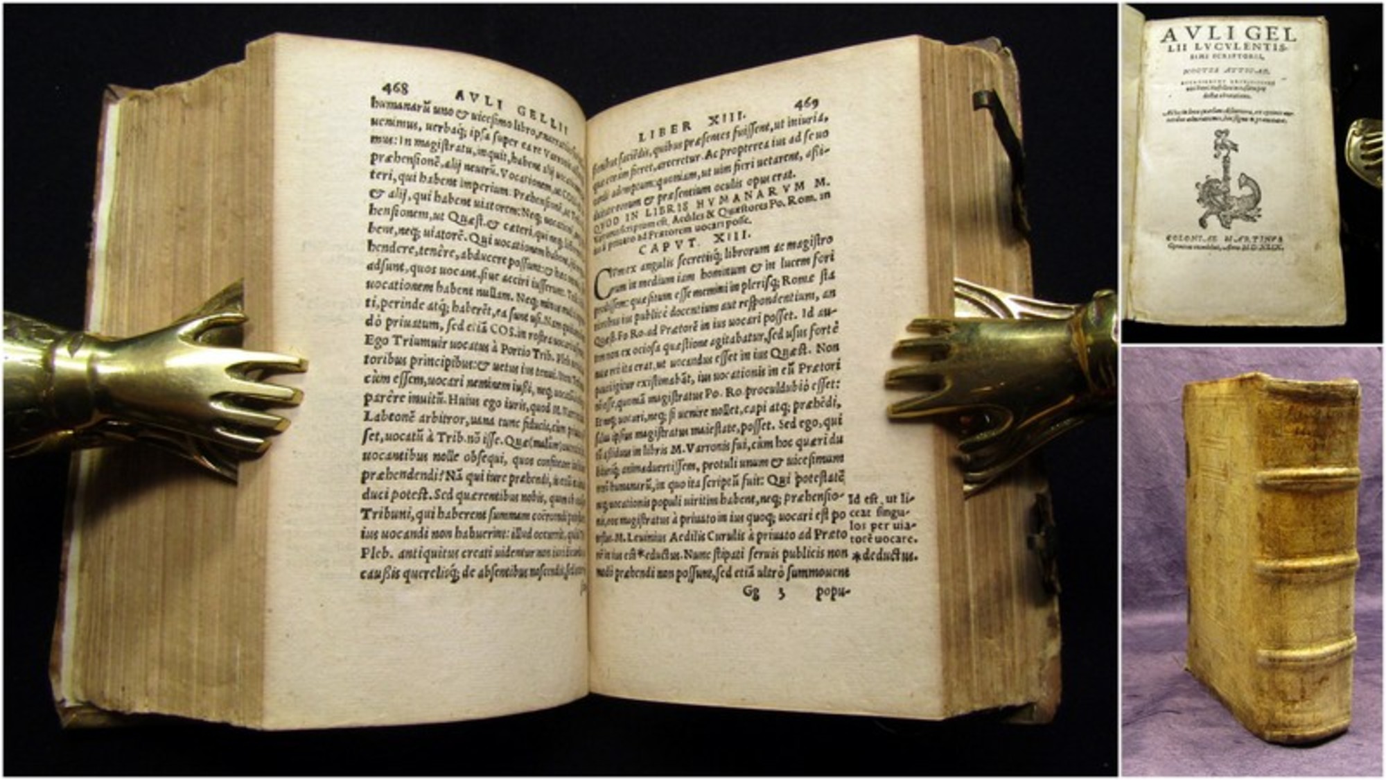 Gellius, Aulus. Noctes atticae. Accesserunt ... Petri Mosellani in easdem per doctae adnotationes.... Köln, Gymnich, Martin, 1549. kl 8°(17x11cm), 1 Druckermerke auf Titel, 23 Bll., 782 S., blindgeprägter Schweinsledereinband d. Zt. mit originalen Schließen. Jöcher IV/208 - Als Materialsammlung ist das Werk noch bis ins Mittelalter von seinen Nachfolgern genutzt worden. Es umfasst Exzerpte aus nahezu allen damals wichtigen Wissensgebieten; Philosophie, Rechtswissenschaften, Geschichte, Literatur und vor allem Grammatik. - Einband berieben und bestoßen, Ecken bestoßen, Rs. liegt dem Buch lose bei, Spiegel mit hs. Vermerken, Papier altersbedingt gebräunt, Seiten stellenw. restauriert (ohne Textverlust). Bestell-Nr: 3-0-178..........verkauft | ![]() | |