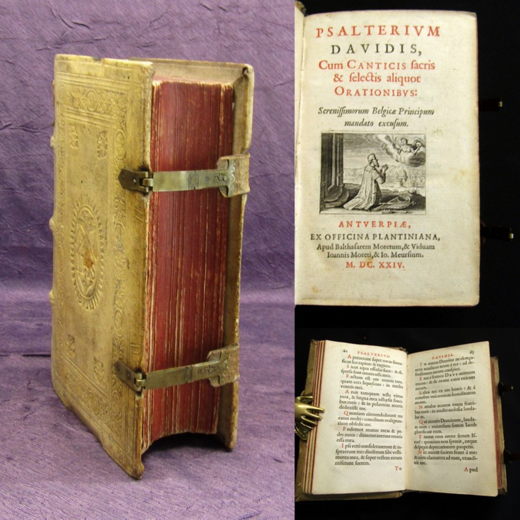 David. Psalterium Davidis, cum Canticis sacris & selectis aliquot Orationibus. Antverpiae, Moretus & Meursius, 1624. kl 8°(17x12cm), Kupferstich-Titelvignette, 604 S., 4 Bll., alte Druckermarke, blindgebprägter Ledereinband mit 2 Schließen. Einband berieben und bestoßen, hs. Rs., roter Rundumschnitt, Vorsatzblätter hs. beschrieben, Papier altersbedingt gebräunt. Bestell-Nr: 3-0-184..........verkauft | ![]() | |