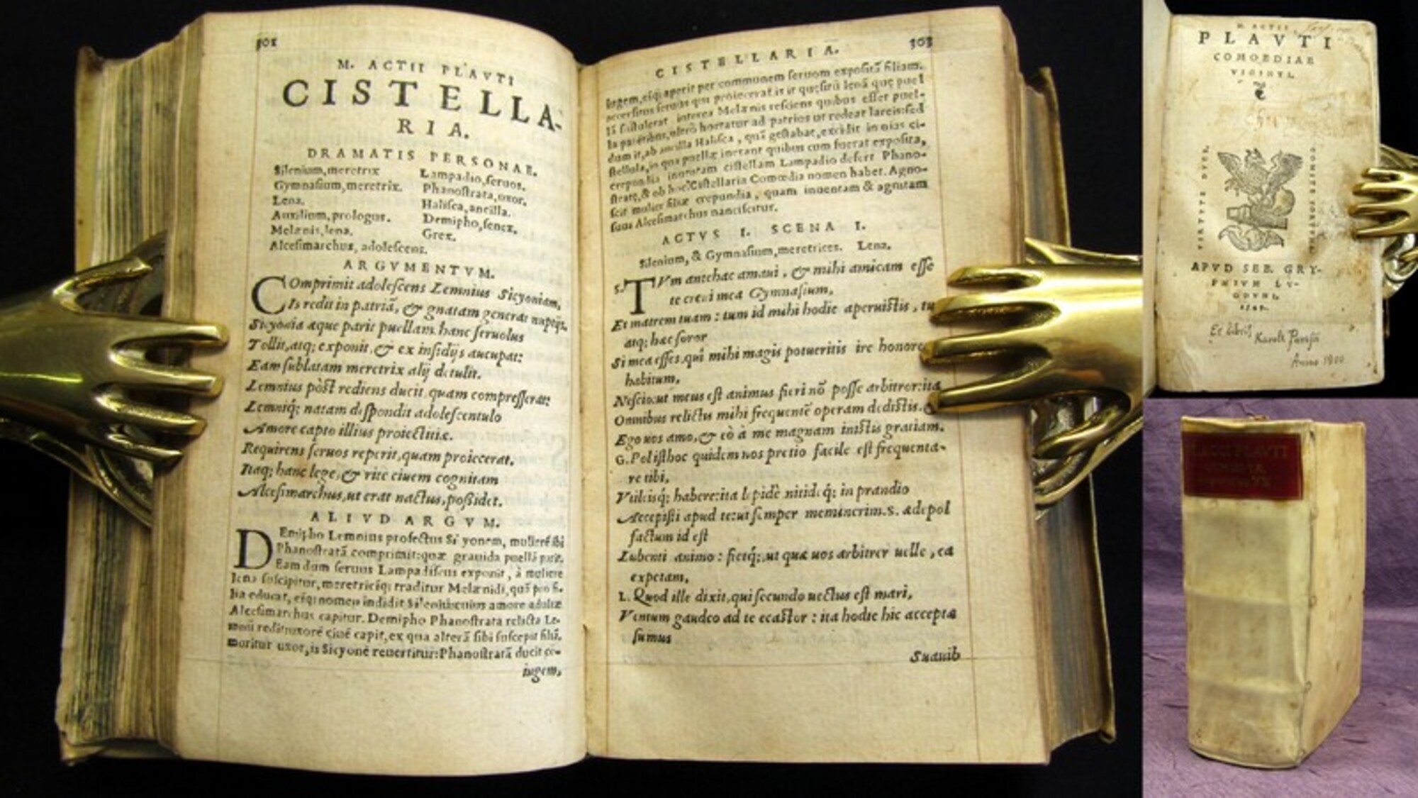Plautus, Titus Maccius. M. Actii Plauti Comoediae viginti. Lugduni, Gryphium, Seb., 1549. 12°(12x8cm), Titelvignette, 1078 S.(S.622-624 Blanko), Pergamenteinband mit spanischen Kanten. Titus Maccius Plautus war ein römischer Dichter. Er war einer der ersten und produktivsten Komödiendichter im alten Rom. - Einband berieben und bestoßen sowie angeschmutzt, hs. Rs., Spiegel erneuert, Titel restauriert (ohne Textverlust) und mit hs. Vermerk, Papier altersbedingt gebräunt und stellenw. fleckig. Bestell-Nr: 3-0-186..........verkauft | ![]() | |