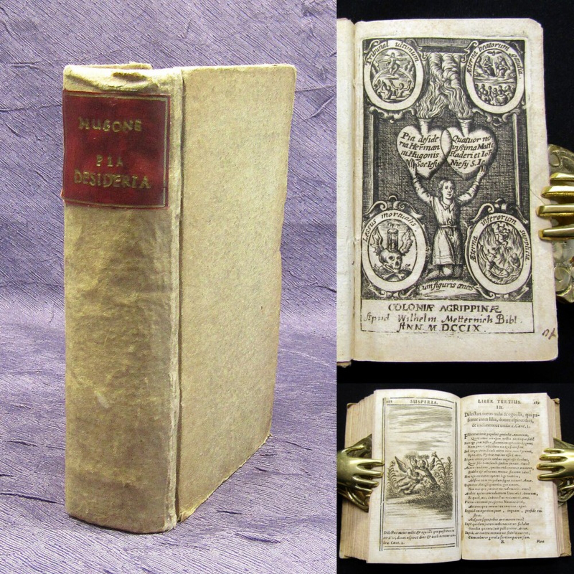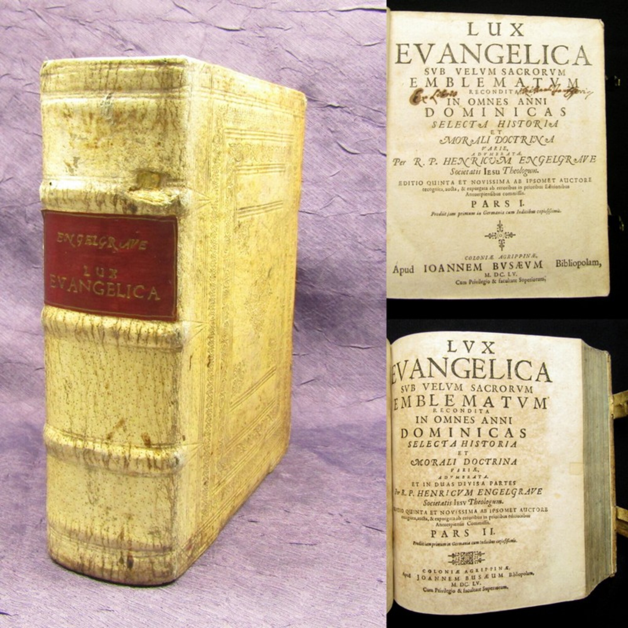 Engelgrave, Henricus. Lux evangelica sub velum sacrorum emblematum recondita in anni dominicas selecta historia & morali doctrina varie adumbrata. 2 in 1 Bd.. Coloniae Agrippinae, Ioannem Busaeum, 1655. 8°(20,5x18cm), 4 Bll., 426 S., 39 Bll., 527 S., 25 Bll., blingeprägter Schweinsledereinband mit 2 Schließen. Das vorliegende, öfters aufgelegte Werk (im Jahre 1659 erschien unter dem Titel Lucis Evangeliae ein dritter Teil dazu) ist Das Hauptwerk dieses belgischen Schriftstellers und Entwerfer von Emblemen. Engelgrave, der zu seiner Zeit auch zu den bedeutendsten Predigern gezählt wurde, verfasste sein Emblembuch wie eine Predigtensammlung. Er beginnt mit den Sonntagen des Advents und arbeitet sich so unter der Bearbeitung der klassischen Bibelstellen durch das Kirchenjahr - Einband berieben und bestoßen, Rücken angeschabt, hs. Rs., florale Blindprägung auf Deckel, Titel mit hs. Vermerken, Papier altersbedingt (stärker) gebräunt und braun- sowie fingerfleckig. Bestell-Nr: 3-0-210..........verkauft | ![]() | |