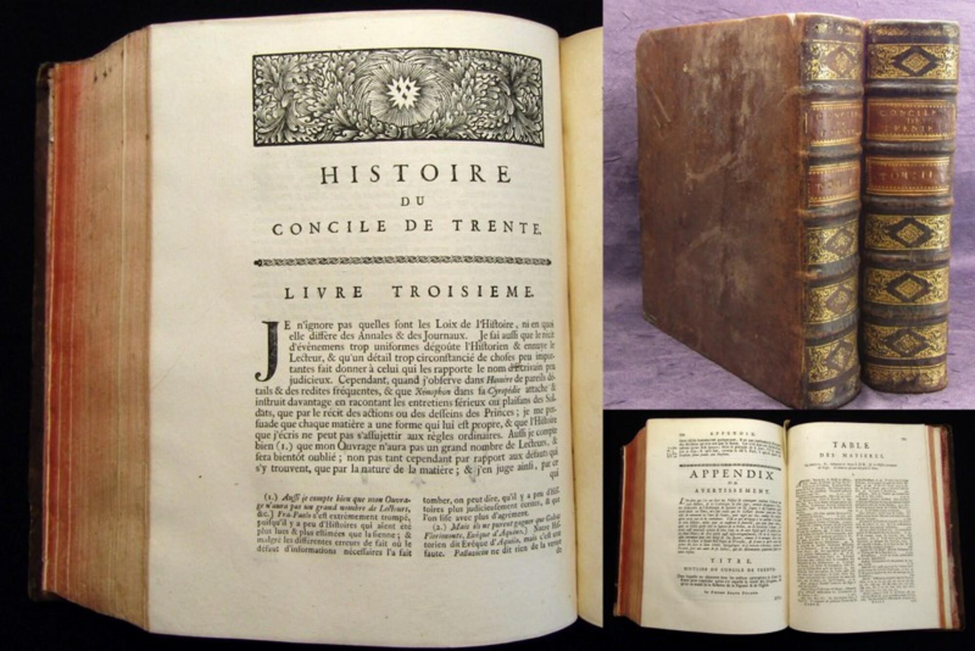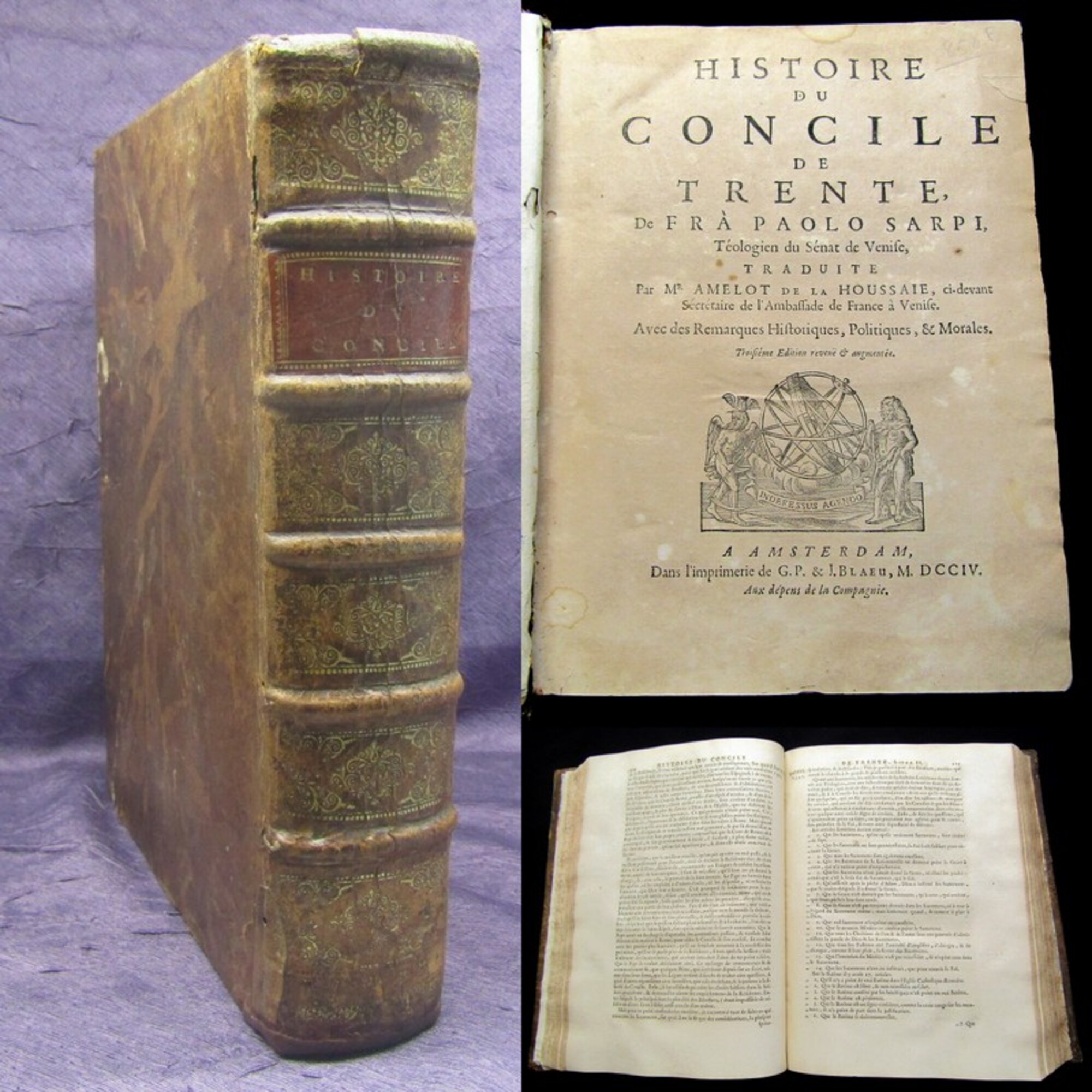 Sarpi, Paolo. Historie de Concile de Trente..., de Fra Paolo Sarpi, Teologien du Senat de Venife...Libri VIII. Amsterdam, Blaeu, 1704. gr.8°(25x21cm), Titelvigentte, 24 Bll., 800 S., 23 Bll., Ledereinband mit 5 Bünden. Ebert II/20358 - Die erste Ausgabe dieser französischen Übersetzung der "Istoria del concilio Tridentino" war 1738 erschienen. - Paolo Sarpi (1552 - 1623) war unter Guglielmo Gonzaga Hoftheologe in Mantua. 1585 wurde er Generalprokurators des Servitenordens und kam nach Rom, dort war es ihm möglich Einsicht in päpstliche Dokumente zum Konzil von Trient zu nehmen. Ab 1589 war er dann in Venedig und hatte auch dort Zugang zu den Archiven. 1619 erschien dann sein Hauptwerk die "Istoria del concilio Tridentino" unter dem Pseudonym Pietro Soave Polano in London, um der päpstlichen Zensur zu entgehen. "Er versuchte nachzuweisen, dass die Wiedervereinigung der Protestanten mit der katholischen Kirche beim Konzil von Trient durch die Intrigen der Kurie verhindert worden sei. John Milton feierte Sarpi in seinen Aeropagitica als den great unmasker (Demaskierer) des Trienter Konzils. Sarpis `Istoria del concilio Tridentino` wurde zur ersten `Meistererzählung` zum Konzil von Trient, teils wegen ihrer unter den zeitgenössischen Gelehrten populären antirömischen Ausrichtung, teils wegen der für damalige Verhältnisse vorbildliche Auswertung der Quellen" (Wikipedia Abruf vom 09.04.2019). - Der Übersetzer Pierre Francois Le Courayer (1681 - 1776) war Professor an der Universität Oxford. "Seiner französischen Übersetzung von Paolo Sarpis großer Geschichte des Konzils von Trient fügte er einen umfangreichen Anmerkungsapparat bei, der große Teile der gegenreformatorischen katholischen Positionen in Zweifel zog". - Einbände berieben und bestoßen, Deckel restauriert, Kapitale angebrochen, Papier altersbedingt stärker gebräunt. Bestell-Nr: 3-0-192..........verkauft | ![]() | |
