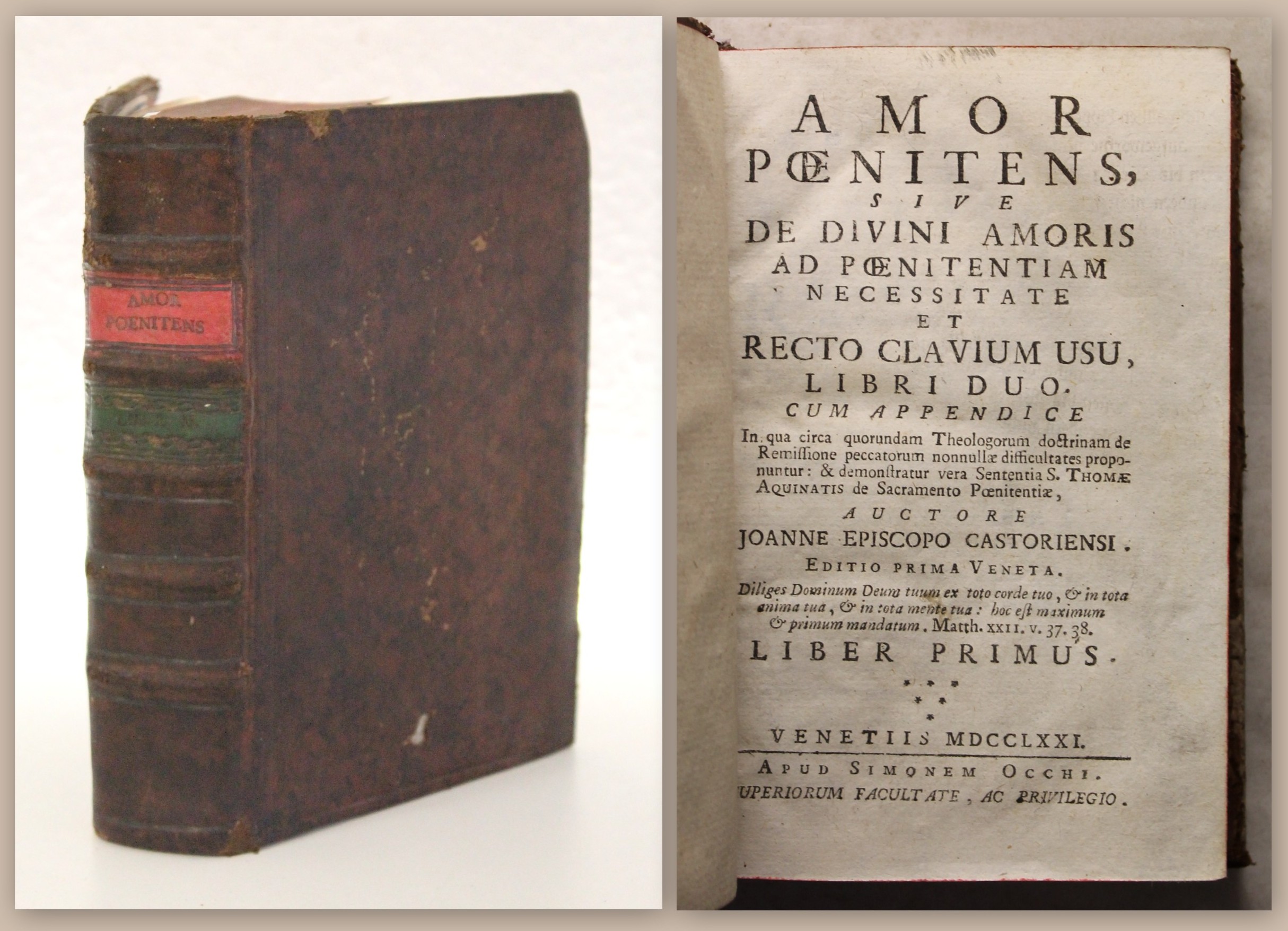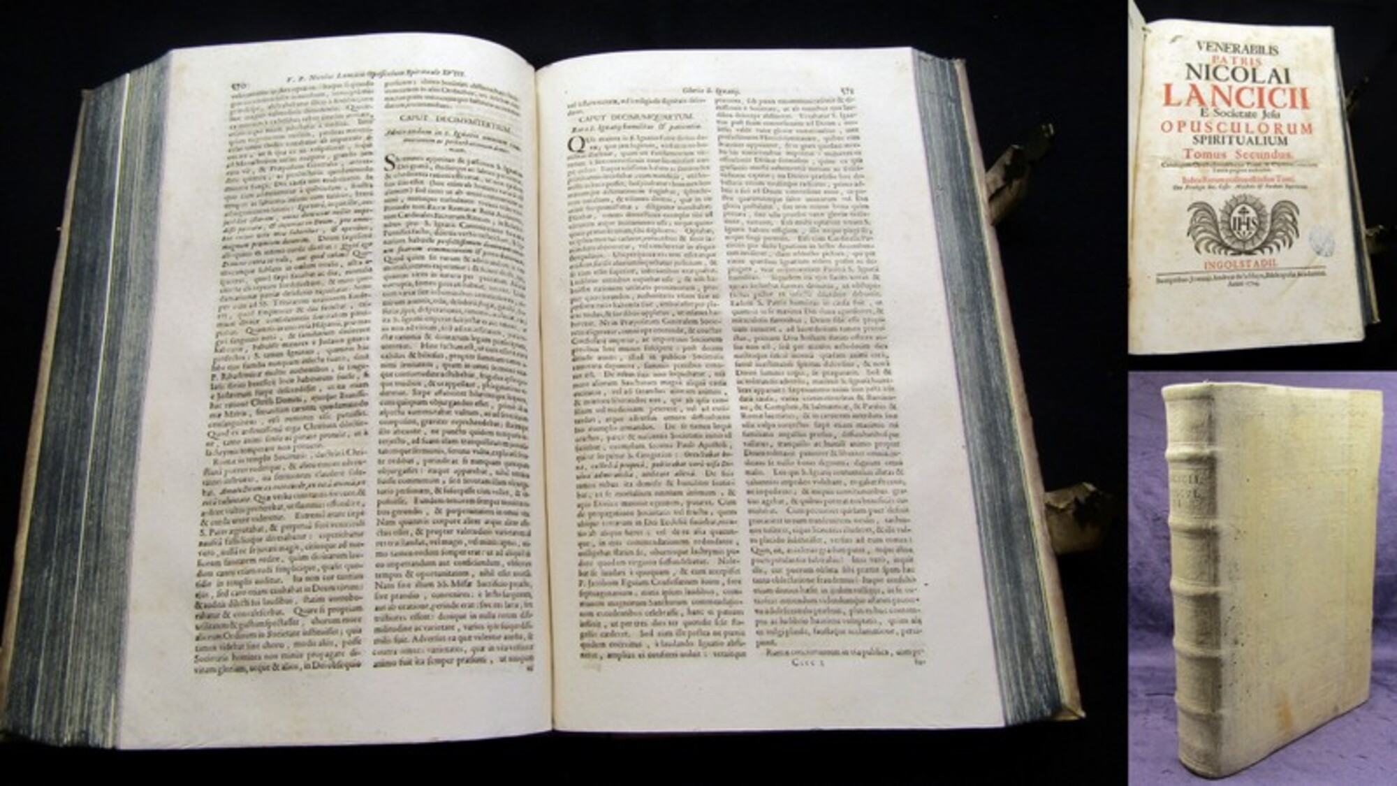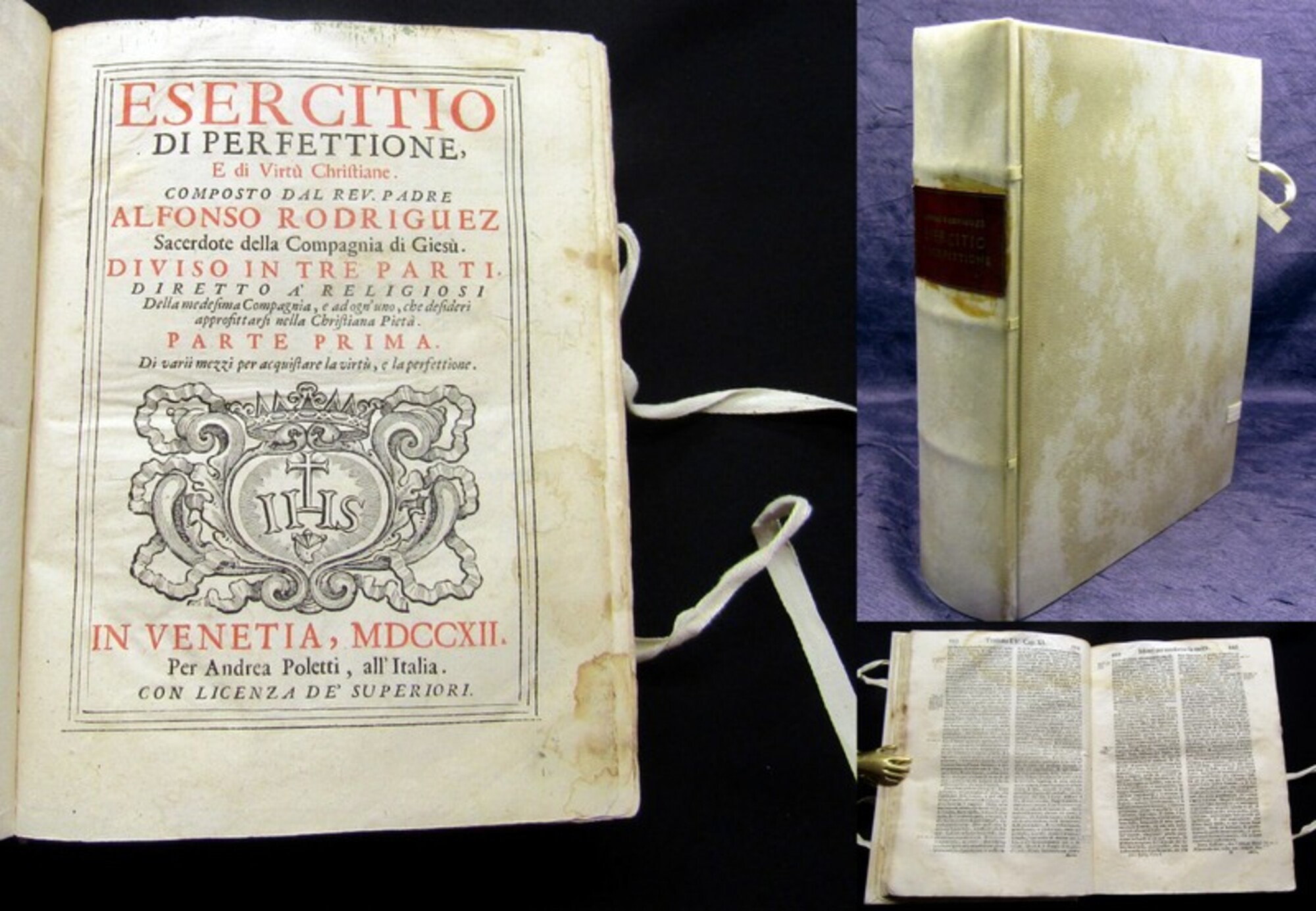 Rodriguez, Alonso. Esercitio di perfettione, e di virtu christiane. Composto dal rev. padre Alfonso Rodriguez sacerdote della Compagnia di Giesu. Diviso in tre parti...Parte prima - terza. Venetia, Poletti, 1712. gr.8°(23x17cm), Titelvignette, 3 Bll., 602 Spalten, 16 Bll., 587 Spalten, 12 Bll., 486 Spalten, 15 nn. S., neuer Pergamenteinband mit Buchbändern. 1: Di varii mezzi per acquistare la virtu, e la perfettione 2: Dell sercito delle virtu appartenenti allo stato religioso... 3: Dell esercitio dalcune virtu appartementi a tutti quelli, che fanno professione si servir a Dio - Einband minimal berieben und bestoßen, hs. Rs., Vorsatz erneuert, ein Seitenrand eingerissen (ohne Textverlust), Papier durchweg wasserrandig und leicht braunfleckig. Bestell-Nr: 3-0-201..........170,00 € (inkl. MwSt. zzgl. Versand) | ![]() | |
