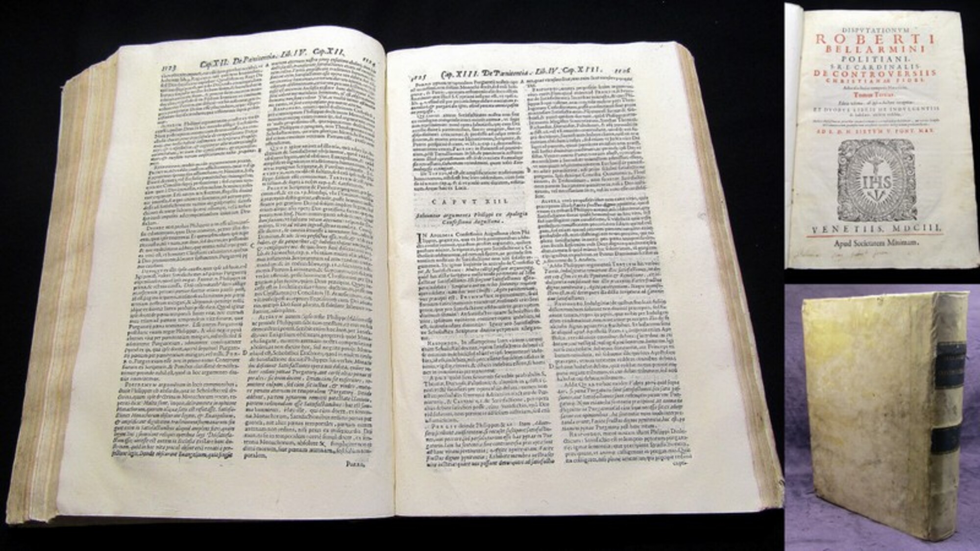 Bellarmino, Roberto. Disputationum Roberti Bellarmini Politiani sre Cardinalis, de controversiis Christian ae Fidei - 3. Bd. (von 4). Venedig, Apud Societatem Minimam, 1603. 4°(32x23cm), Druckermarke auf Titel, 10 Bll., 1427 Spalten, 587 Bll., Pergamenteinband . Graesse I, 326 - Hauptwerkt einer Synthese der katholischen Kontroverstheologie des 16. Jh. Roberto Bellarmino; einer der bedeutensten kath. Theologen seiner Zeit; Jesuit; lehrte 1570.1576 Theologie in Löwen; 1602-05 Erzbischof von Capua; seit 1599 Kardinal. - Einband berieben und bestoßen sowie fleckig, einige kleine Bezugsfehlstellen durch Wurmfraß, 2 Rs., Spiegel mit Wurmfraß, Besitzvermerk auf Titel, Papier fast durchgehen etwas stockfleckig (einige Bll. stärker), wenige Bll. mit Wurmgängen, zweispaltiger Druck. Bestell-Nr: 3-0-194..........250,00 € (inkl. MwSt. zzgl. Versand) | ![]() | |