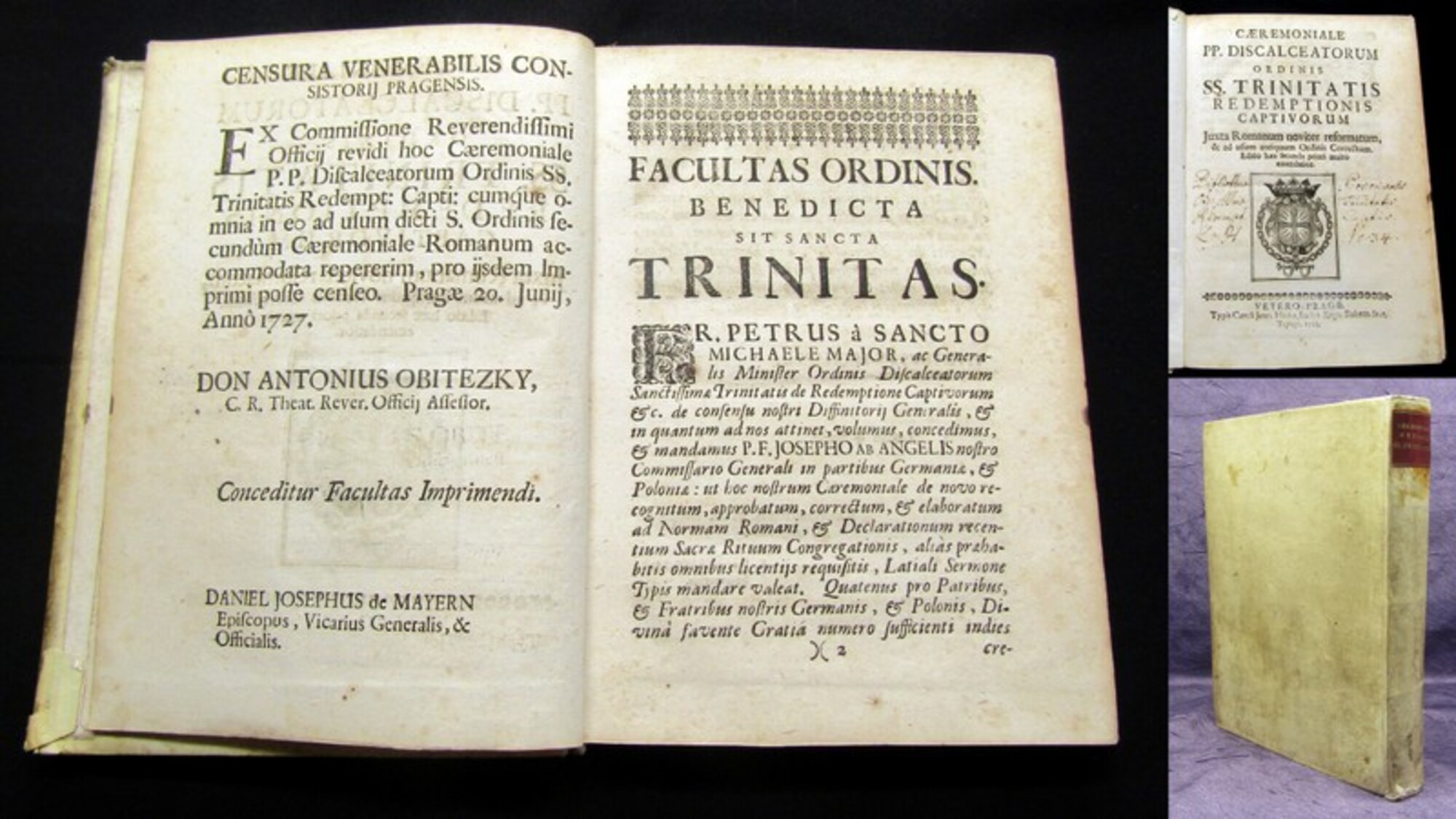 Anonym. Caeremoniale PP. Discalceatorum Ordinis SS. Trinitatis Redemptionis Captivorum : Juxta Romanum noviter reformatum .... Vetero-Pragae, Hraba, 1728. 8°(21x16cm), alter Bibliotheksstempel, Titelvignette mit Wappendarstellung, 4 Bll., 258 S., 3 Bll.(Index), Pergamenteinband. Einband berieben, bestoßen und fleckig, hs. Rs., Vorsatz mit hs. Vermerk und altem Bibliotheksstempel, Titel mit hs. Notizen, roter Rundumschnitt, Papier durchweg braunfleckig(teilw. auch stärker), 3 Bll. mit Tintenflecken (2 davon mit Tintenfraß und textverlust), Schnitt auf den ersten Seiten Tintenfleckig. Bestell-Nr: 3-0-197..........250,00 € (inkl. MwSt. zzgl. Versand) | ![]() | |