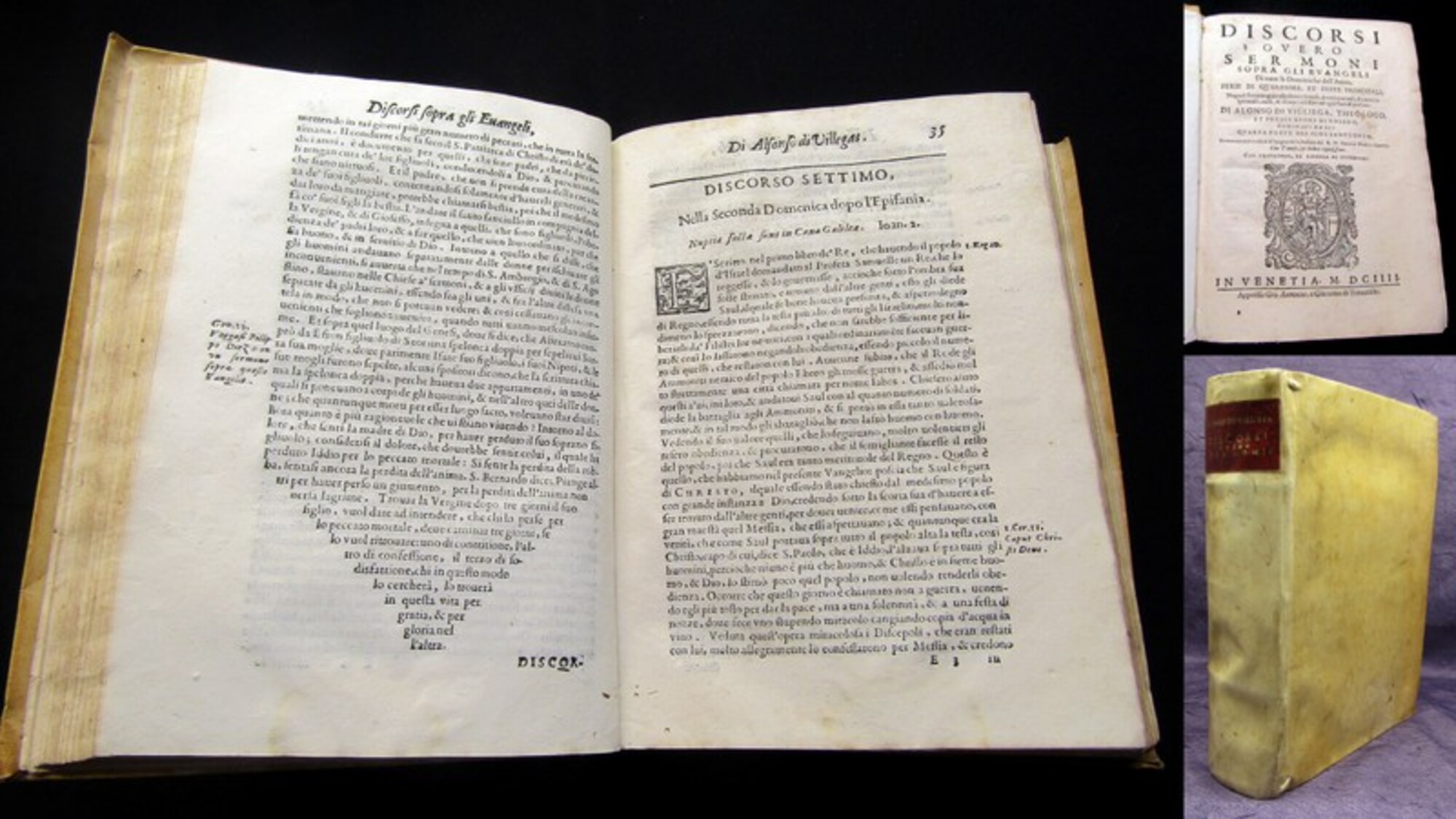 Villegas, Alonso de; Grazi, Grazio Maria. Discorsi overo sermoni sopra tutti gli Evangeli di tutte le dominiche dell`anno, ferie di Quaresima. Venedig, Gio, Antonio, Giacomo de Franceschi, 1604. 8°(22x17cm), Titelvignette, 29 Bll., 417 S., Pergamenteinband. Jöcher IV/1621 - Alonso de Villegas Selvago, auch bekannt als Selvago, was möglicherweise auch ein zweiter Nachname war, genuesischer Herkunft war ein spanischer Geistlicher und Schriftsteller. Hier handelt es sich um den gesondert erschienen 4. Teil des "Flos vitis/janetorum" - Einband berieben und bestoßen, fleckig und leicht verzogen, Deckel wurmspurig, vorder sowie letzter Seiten mit Wurmfraß, Spiegel mit hs. Vermerk, Papier altersbedingt leicht gebräunt, Eine Seitenecke gerissen. Bestell-Nr: 3-0-198..........verkauft | ![]() | |