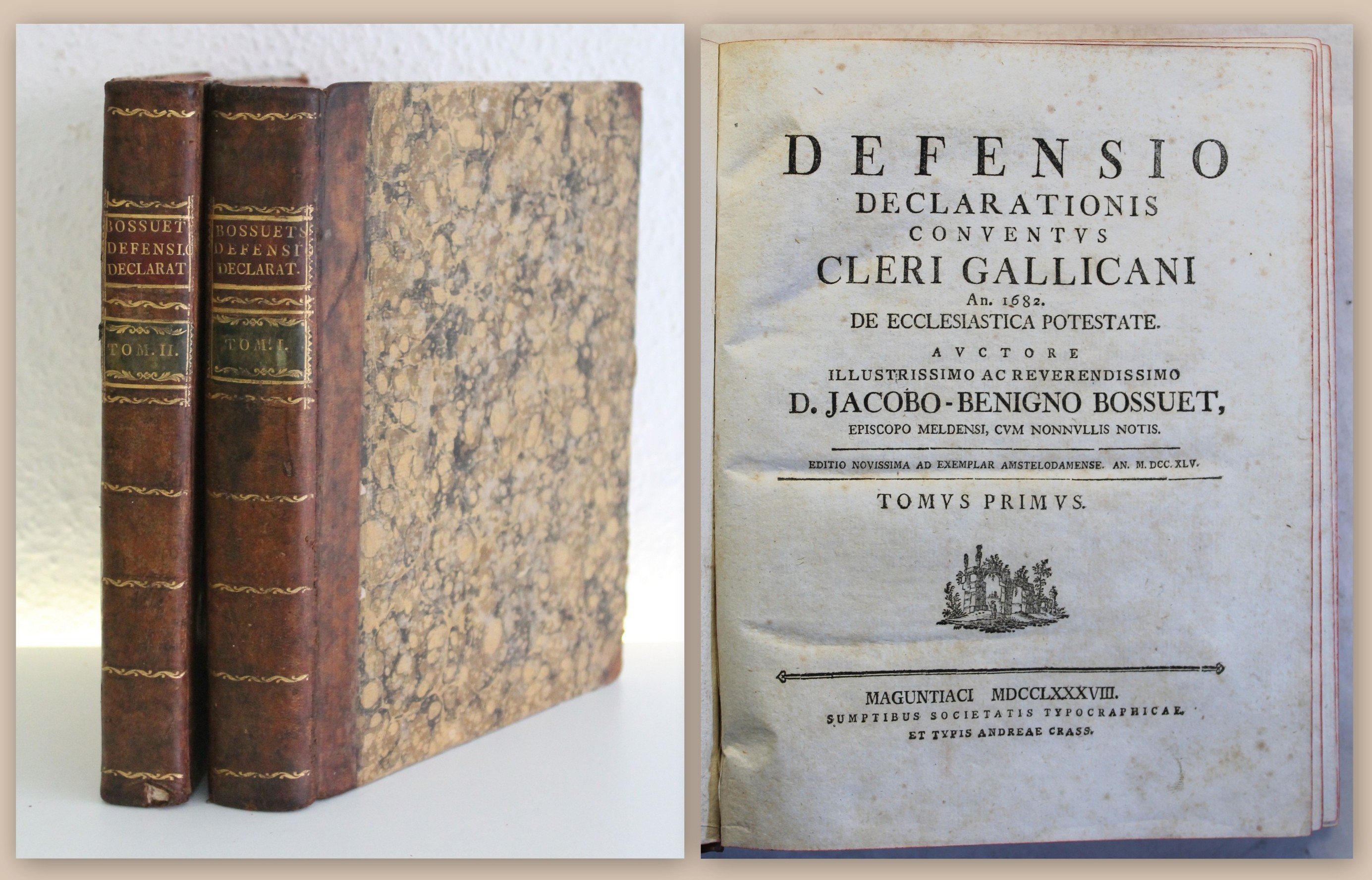 Bossuet, Jacques Benigne. Defensio Declarationis Conventus Cleri Gallicani An. 1682. De Ecclesiastica Potestante [...] Editio novissima ad Exemplar Amstelodamense An. 1745. 2 Bd. Maguntia (Mainz), A. Crass, 1788. 4°, XL, 548 S.; 143 S., HLdr. d. Zt. mit je 2 Rückenschildern. Einbände etwas berieben und bestossen. Saubere Exemplare , teils braunfleckig. Band 2 mit gest. Titel und gelöschtem Besitzvermerk. Vorsatz von Band 1 gestempelt, Spiegel mit altem hs. Besitzeintrag. Bestell-Nr: 3-0-2..........250,00 € (inkl. MwSt. zzgl. Versand) | ![]() | |