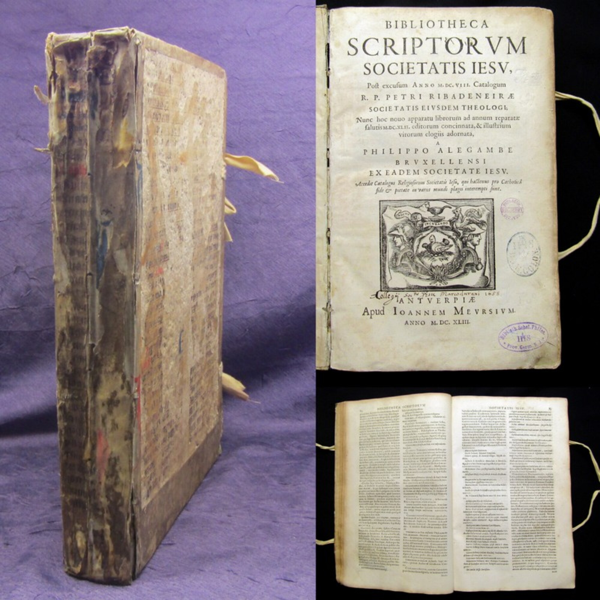 Ribadeneyra, Pedro de; Alegambe, Philippe. Bibliotheca Sriptorum Societatis lesv: Post excusum anno 1608 catalogum R.P. Petri Ribadeneirae,...nunc hoc novo apparatu librorum ad annum... 1642 editorum cincinnata et illustrium virorum elogiis adornata a Philippo Alegambe,.... Antverpiae, Meursium, 1643. 4°(30x20cm), Titelvignette, alte Bibliotheksstempel, alte Druckermarke, 11 Bll., 587 S., Pergamenteinband mit Buchbändern. Philipp Alegambe war ein Jesuit und Historiker. Alegambe trat zunächst in den Dienst des Herzog von Ossun in Spanien, den er auf seiner Reise als Vizekönig von Sizilien begleitete. Am 7. September 1613 schloss er sich in Palermo einem Jesuitenorden an. - Einband stark berieben, bestoßen, angeschmutzt und mit beschnittenem Deckeln, Vorsatz mit hs. Vermerken, Papier altersbedingt gebräunt (stellenw. stärker), Ränder bis zur Hälfte wasserfleckig, etwas fingerfleckig. Bestell-Nr: 3-0-205..........verkauft | ![]() | |