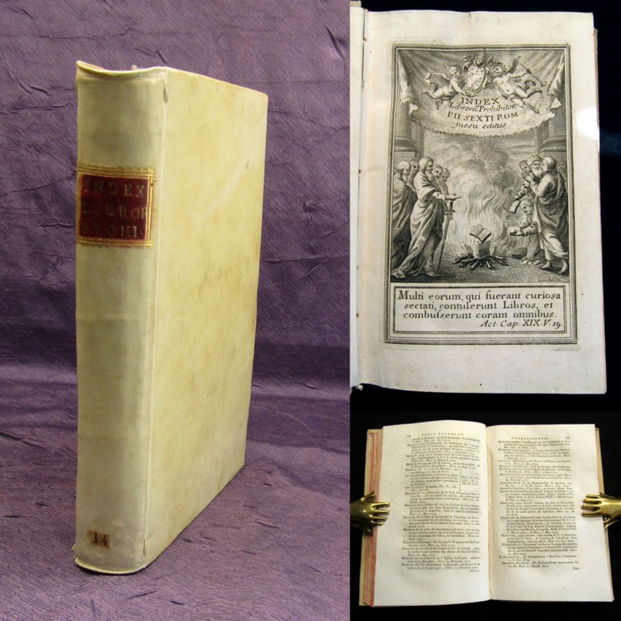 . Index librorum prohibitorum Sanctissimi domini nostri Pii Sexti Pontificis Maximi Jussu Editus.. Rom, Ex typographia Rev. Camerae Apostolicae, 1784. 8°(19x13cm), gestochener Titel, Titelvignette, XLIV, 323 S., 6 S., 5 S.(1), 8 S., Pergamenteinband d.Zt.. Index Verbotener Bücher. Lange Zeit gab es eine ganze Reihe von Büchern, die Katholiken nicht lesen durften – bis vor 57 Jahren. Am 9. April 1966 wurde durch ein Interview bekannt, dass der Index der verbotenen Bücher nicht mehr in Kraft sei. - Einband leicht berieben und bestoßen, rotes, goldgeprägtes Rs., rote Rundummarmorierung, Papier altersbedingt gebräunt, schönes Exemplar. Bestell-Nr: 3-0-209..........verkauft | ![]() | |