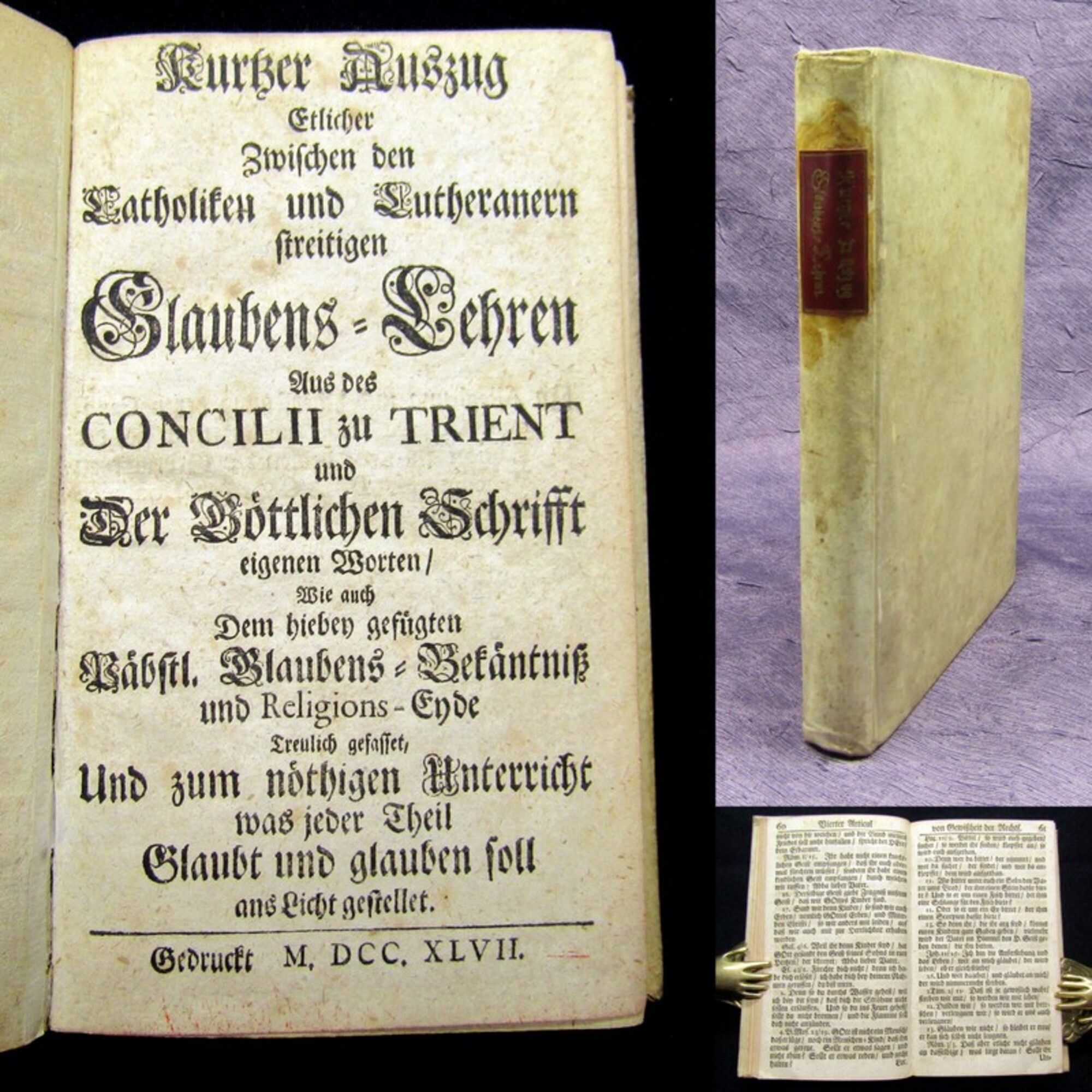 . Kurzer Auszug etlicher zwischen den Katholiken und Lutheranern streitigen Glaubens-Lehren aus des Concilii zu Trient und der Göttlichen Schrift [...]. Venedig, Farris, Dominico de, 1747. kl8°(17x10,5cm), 207 S., 1 nn.S., Pergamenteinband. Einband berieben und bestoßen, hs., rotes Rs., roter Rundumschnitt, Papier altersbedingt gebräunt. Bestell-Nr: 3-0-213..........verkauft | ![]() | |