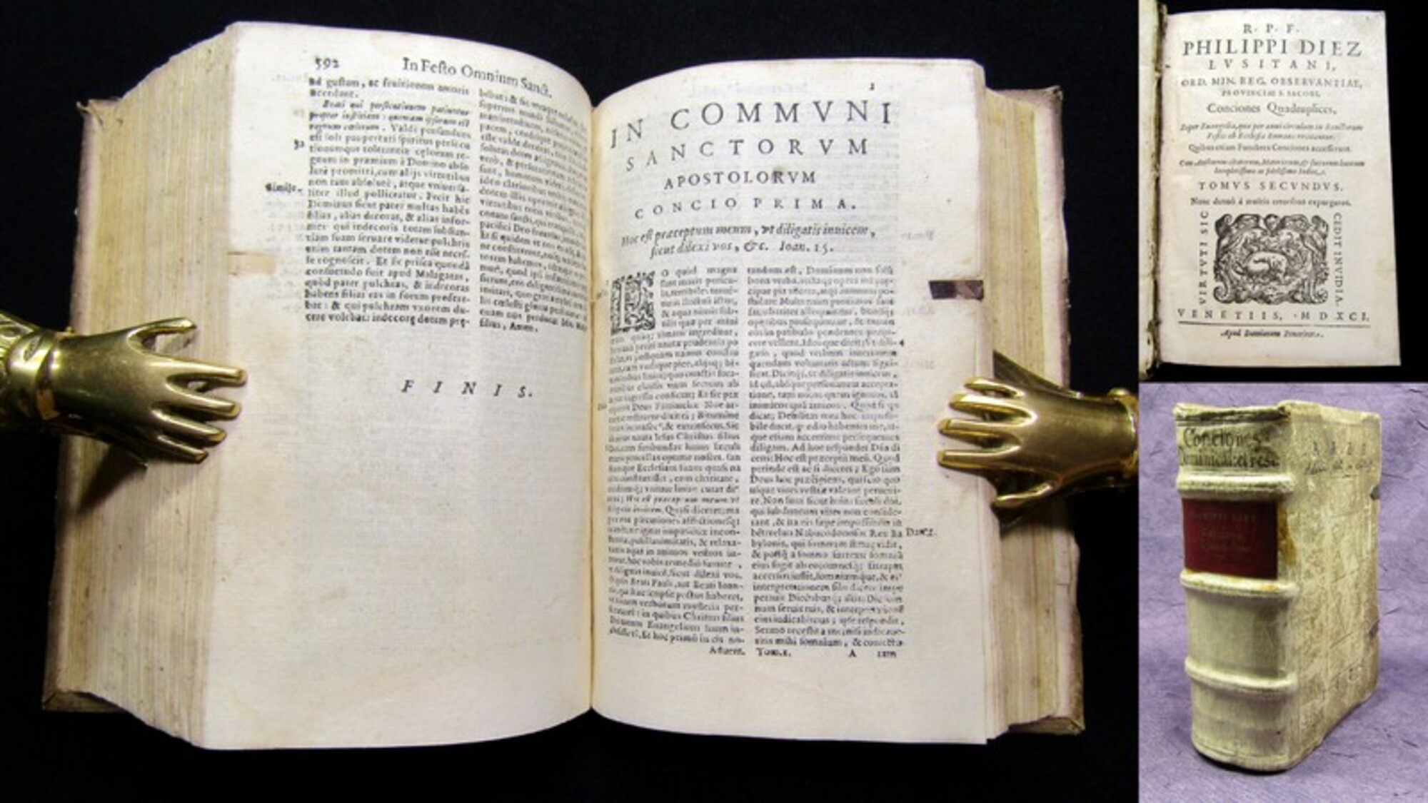 Diez, Felippe. R.P.F. Philippi Diez Lusitani, ord. min. reg. observantiae, provinciae S. Iacobi [...] Tomus secundus ; In Communi sanctorum Apostolorum concio prima 2 in 1 Bd.. Venedig, Farri, Domenico de, 1591. kl8°(18x13cm), Titelvignette, 48 Bll., 592 S.; 318 S., blindgeprägter Pegamenteinband (Schließen fehlen). Einband berieben, bestoßen und angeschmutzt, hs. Rs., Bindung innen angebrochen, Papier altersbedingt leicht gebräunt. Bestell-Nr: 3-0-215..........verkauft | ![]() | |