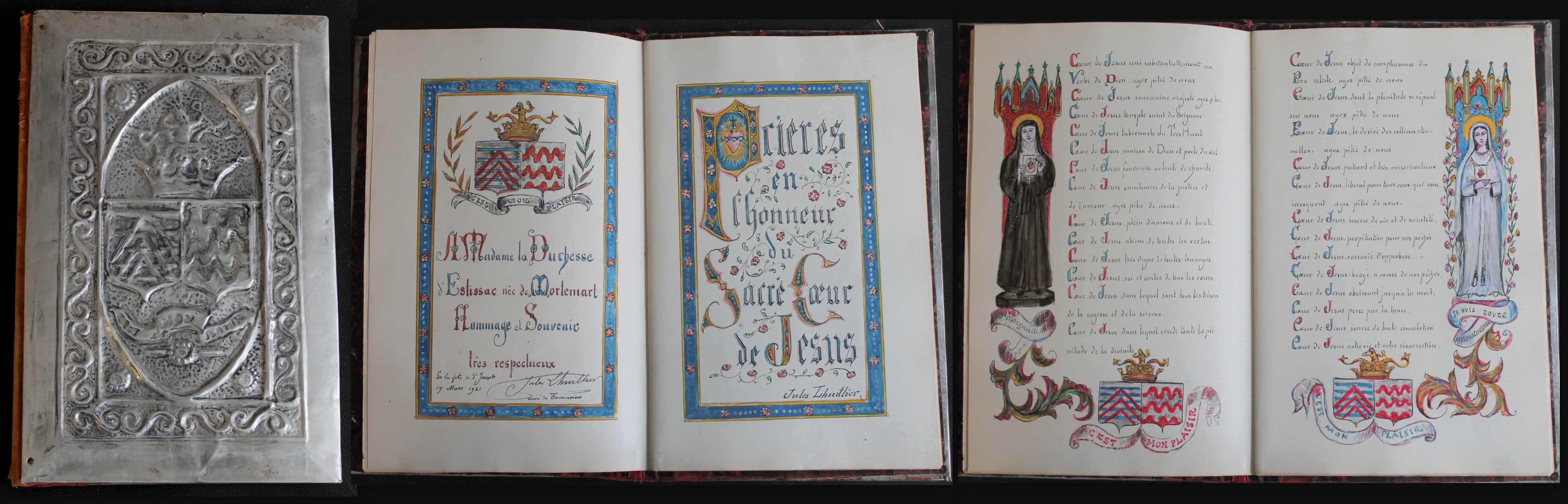 Lhuillier, Jules. Prieres en l' Honneur du Sacre Coeur de Jesus. o.O., , um 1920. kl. 4°, mit einer ganzseitigen Miniatur sowie 14 Kleinbildminiaturen und Bordüren. Französische Handschrift, Satzspiegel: 21 x 13 cm. Schriftspiegel: 8,5 x 17 cm. 1 Bl., 14 Bll. 1 Bl. HLwd. mit reich geprägten Metalldeckeln . Hergestellt wurde das Werk von Abt Jules Lhuillier, Ritter des Ordens St.Sava, der es der Herzogin von Estissac (Haus La Rochefoucauld) und Mortemart widmete "Madame la Duchesse Estissac néc de Mortemart. Hommage et Souvenire très respecteux Jules Lhuillier 18. Mars 1921"- Zur künstlerischen Ausstattung: Der getriebene Metalleinband zeigt das Wappen der Familie Rochefoucauld und Mortemart. Die Handschrift enthält zahlreiche Kleinbildminiaturen meist im Bordürenrahmen die von breiten Rankenwerk, Wappen und zahlreichen Intitialen umrahmt werden. - Die Miniaturen im Einzelnen: fol.3r. Christus, 3v. Hl. Margareta, 4r.Hl. Maria, 5r. Christus am Kreuz, 5v. Hl. Maria, 6r. Hl. Joseph, 6v./7r. Hl. Montstranz und Kelch, 7 v. Hl. Franz v. Assisi, 8r. Hl. Bernhard, 9v. Hl. Jeanne de Chantal, 10r. Hl. Francois de Sales. - Buchblock in sich intakt aber als Ganzes, ursprünglich von einem Band gehalten, vom Einband gelöst. Seiten meist im guten Zustand nur seltener minmal gebräunt oder fingerfleckig. - Eindrucksvolles Manuskript mit zahlreichen Miniaturen und Illustrationen. Bestell-Nr: 3-0-22..........verkauft | ![]() | |