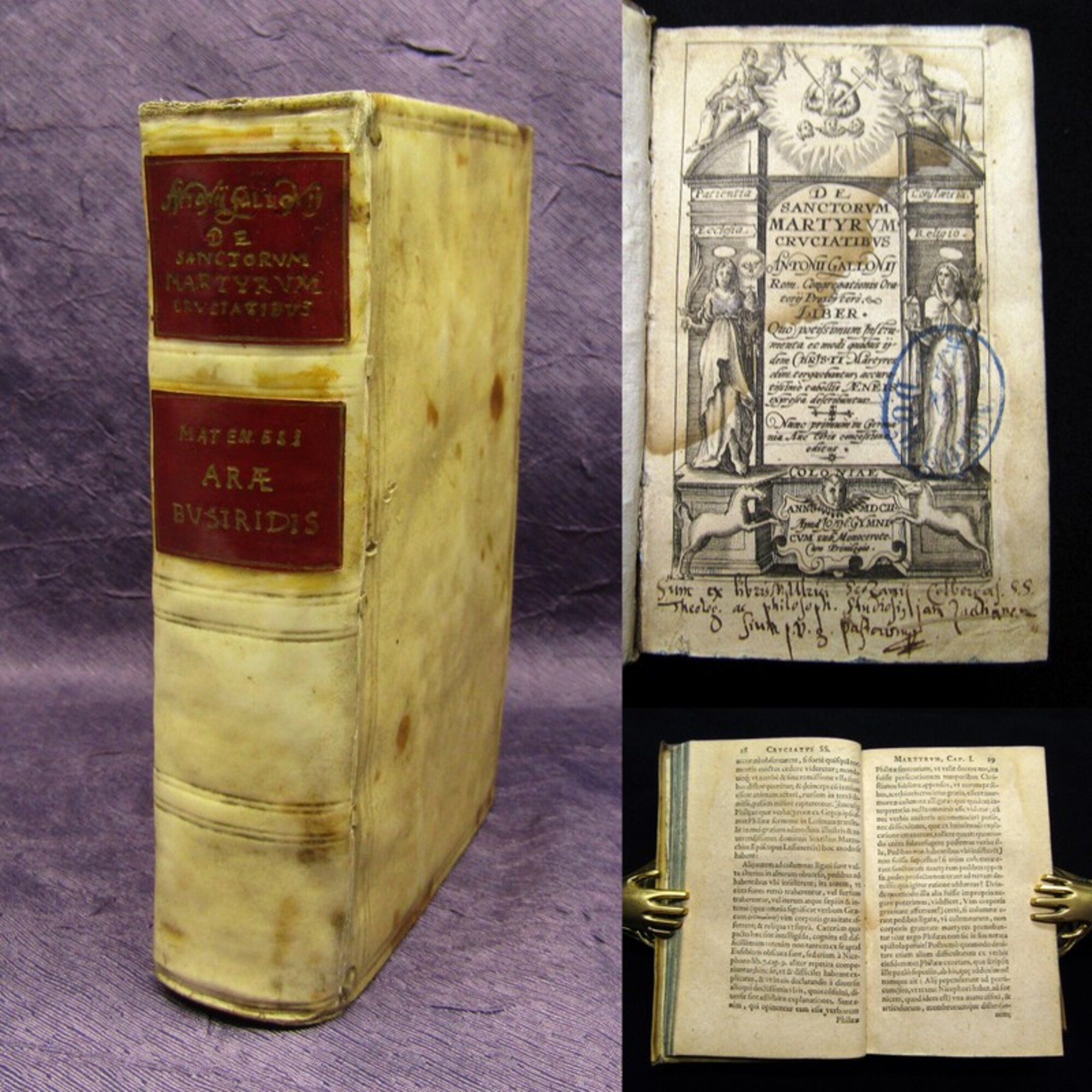 Gallonii, Antonii. De sanctorum martyrum cruciatibus.. Köln, Joan Gymni, 1602. kl. 8°(16x10cm), gest. Titel, 2 Kupfertafeln, 7 Bll., 376 S., 20 Bll.(Index), 1 Bll., 91 S., Pergamenteinband mit spanischen Kanten. Erste Ausgabe der seltenen Abhandlung! Die meisten Exemplare enthalten 25 Kupfertafeln, unser Exemplar ist mit 2 Kupfertafeln ausgestattet. - Einband berieben und bestoßen, 2 hs. Rs., Spiegel mit alten Bibliotheksnachweis, Titel mit alten Bibliotheksstempel und hs. Vermerken, erste Seiten wasserrandig/braunfleckig, Papier altersbedingt gebräunt.. Bestell-Nr: 3-0-221..........verkauft | ![]() | |