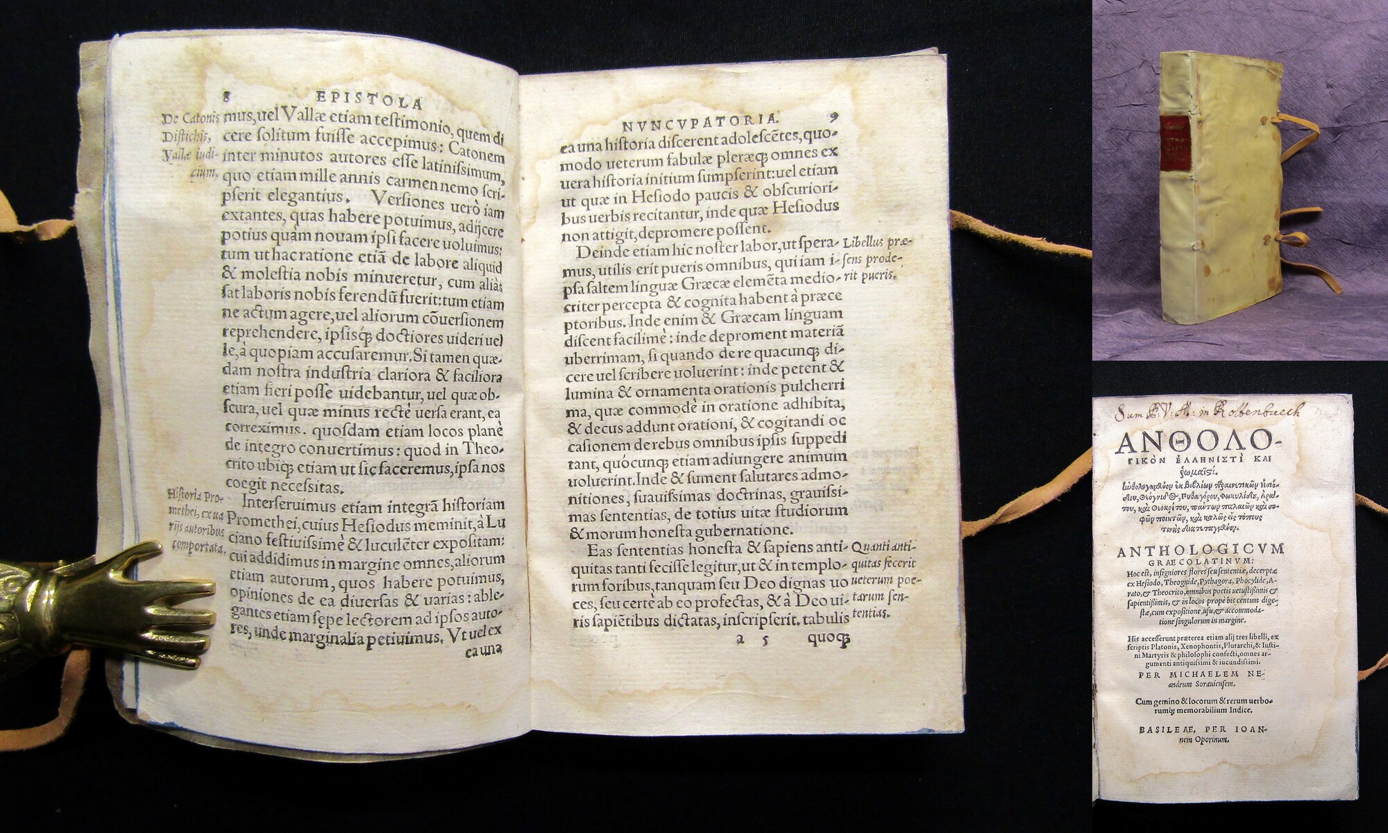 Naso, Publius Ovidius . Poetae Sulmonensis Fastorum Libri VI - Tristium V - De Ponto IIII - in Ibin [...] cum Commentariis [...] His Acceserunt ennarationes Viti Amerpacij, Jacobi Micylli & Philippi Melanchthonis Annotationes [...]. Basel, Johannes Herwagen d. Ä, 1550. kl. Folio (30,5x22cm), mit einigen Holzschnittinitialen, 4 nn. Bll., 793(1) S., 5 nn. Bll., ldr. mit reichhaltig goldgepr. Rücken. Einband etwas berieben, beschabt, leicht bestoßen. Papier etwas gebräunt und teils etwas braunfleckig. Titel angerändert, mit gelöschtem Besitzeintrag und altem Bibliotheksstempel. Die ersten Blatt in unterer Ecke mit kleinen Läsuren, die letzten Blatt mit Feuchtefleck in unterer Ecke, kleinem Wurmloch und Randläsuren im rechten Weißen Rand. Bestell-Nr: 3-0-111..........verkauft | ||