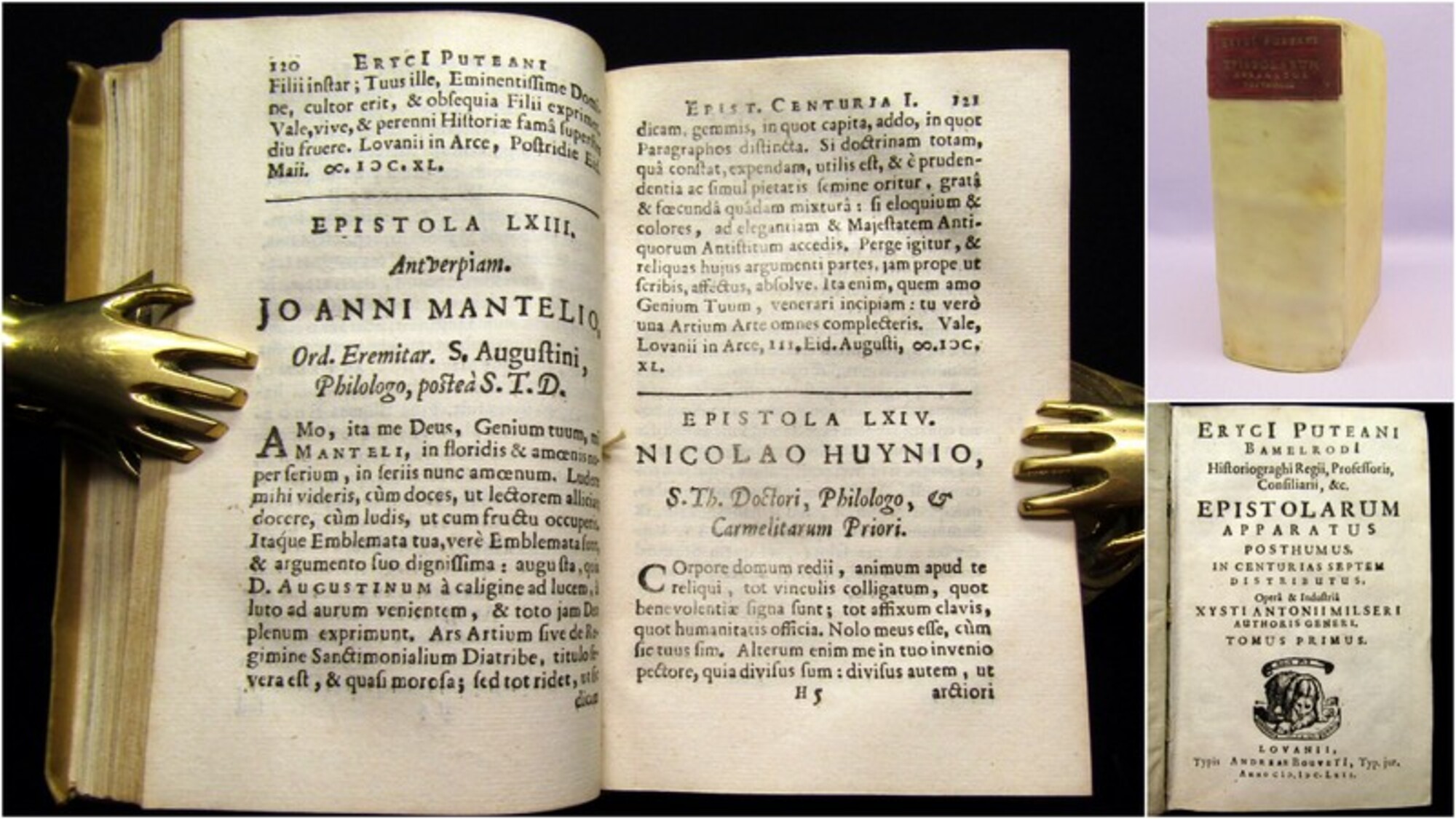 Puteanus, Erycius. Epistolarum Apparatus Posthumus . Lovanii (Löwen in Belgien), Andreae Bouveti, 1662. kl8°(15x10cm), Exlibri, gest. Titel, 30 Bll., 183 S., 14 nn.S.; 173 S., 12 nn.S.; 176 S., 6 Bll.; 125 S., 4 Bll., 133 S., Pergamenteinband mit span. Kanten. Erycius Puteanus war ein Humanist und Professor für Latein am Collegium Trilingue der Universität Löwen. Das postum erschienene Werk enthält in 7 Büchern (1 Band) die Briefe Puteanus`, ausserdem zu Anfang eine kurze Biographie. - Einband berieben und bestoßen, am hinteren Deckel 2 braune Flecken, hs. Rs., Papier minimal gebräunt/braunfleckig. Bestell-Nr: 3-0-228..........750,00 € (inkl. MwSt. zzgl. Versand) | ![]() | |
