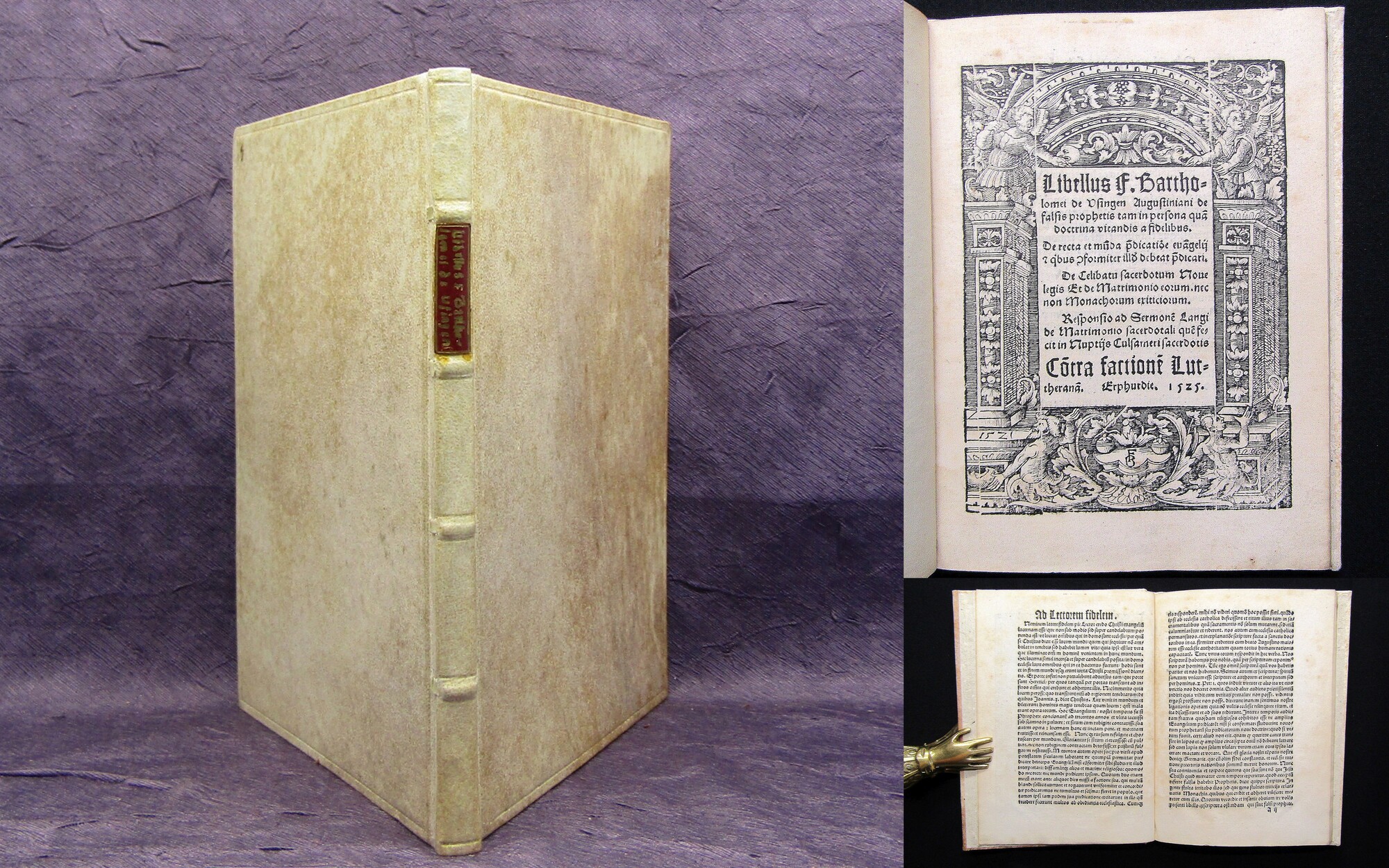 Arnoldi, Bartholomäus. Libellus F. Bartholomei de Vsingen Augustianiani de falsis prophetis tam in persona qua(m) doctrina vitandis a fidelibus. De recta et mu(n)da p(rae)dicatio(n)e eua(n)gelij & q(ui)bus (con)formiter ill(us) debeat p(rae)dicari. De celibatu sacerdotum noue legis et de matrimonio eorum. nec non monachorum exiticiorum. Responsio ad sermone(m) Langi de matrimonio sacerdotali que(m) fecit in nuptijs Culsameri sacerdotis. Co(n)tra factione(m) Lutherana(m). Erfurt, (Matthes Maler), 1525. 8° (19,5x15cm), mit Holzschnitt-Titelbordüre, 40 Bll., Pgmt. im Stil d. Zt. mit RSchild. VD16, A 3702. ; Paulus, 130 (16). ; Von Hase, 543 - Seltene Schrift, welche die Position von Luthers Anhängern in Bezug auf Ehe von Priestern sowie andere von Luther und seinem Kreis vorgeschlagene Reformen angreift. Die Titelbordüre monogrammiert "FB" und datiert 1521. - Einband gering aufgebogen. Vorsätze erneuert. Etwas feuchtrandig, vereinzelt stock- bzw. minimal sporfleckig. Letzte 2 Bll. im weißen Rand hinterlegt. Wohlerhaltenes Exemplar. Bestell-Nr: 3-0-233..........500,00 € (inkl. MwSt. zzgl. Versand) | ![]() | |