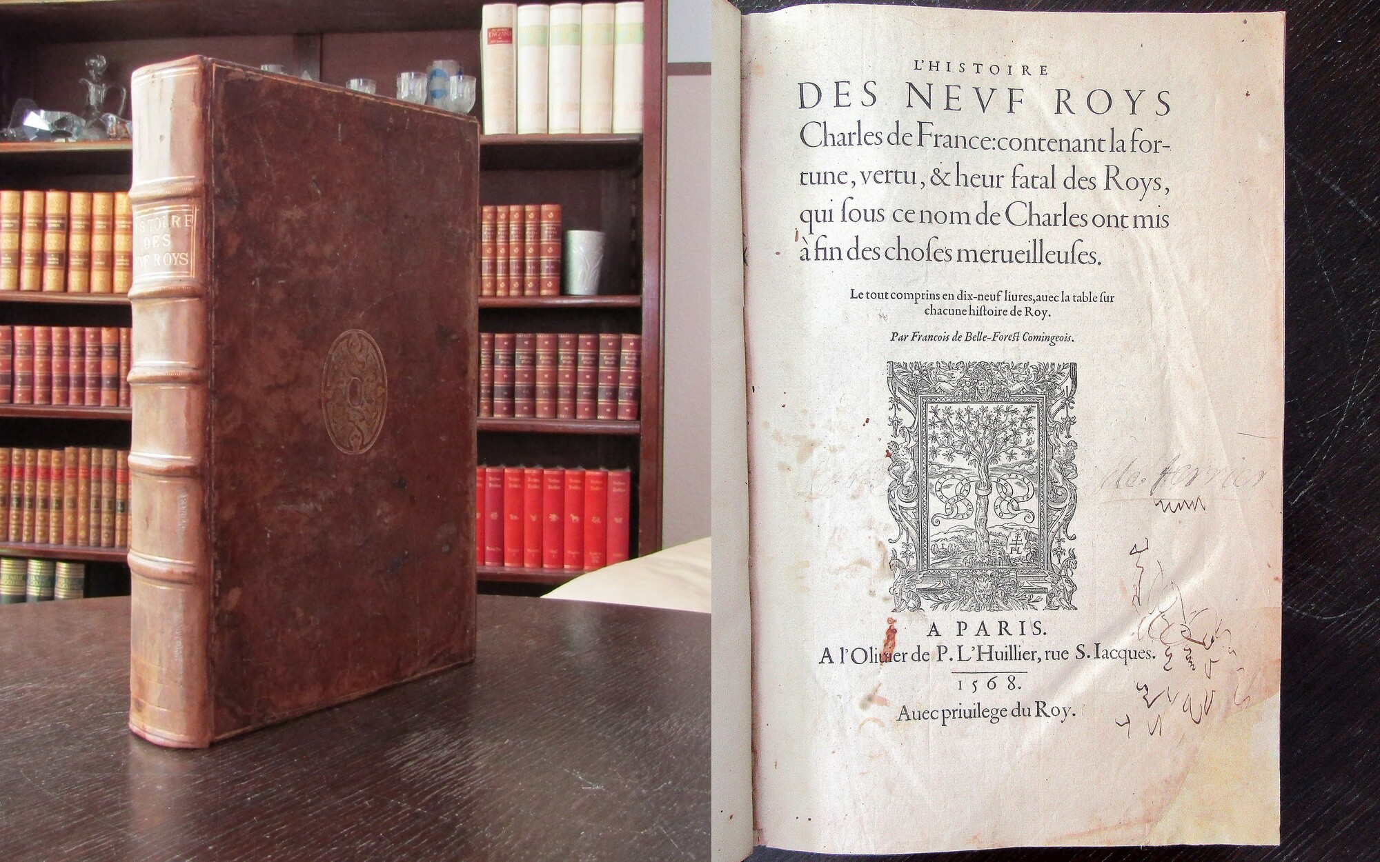 Belleforest, Francois de . L'Histoire des neuf Roys Charles de France : contenant la fortune, vertu, & heur fatal des Roys, qui sous ce nom de Charles ont mis à fin des choses merveilleuses. Le tout comprins en dix-neuf livres, avec la table sur chacune histoire de Roy. Paris, Pierre L, 1568. Folio (34x23 cm), mit zahlreichen figürlichen Holzschnittbordüren und Initialen, 6 Bll., 684 S., 17 (von 19), rest. Ldr. d. Zt. mit goldgepr. Deckelvignette. Hauser 1437. ; Adams B 512 - Erste Ausgabe. Die teils grotesk verzierten Initialen gelten als eine der einfallsreichsten seiner Zeit. Die E-Initiale auf Seite 190 z.B. stellt den berühmt ewordenen verrückten Gelehrten dar, der später von Pierre Le Voirrier in den 1582 veröffentlichten Werken des Tacitus aufgegriffen wurde. - Einband etw. fleckig u. berieben, Rücken im Stil d. Zt. erneuert. Teils etwas fleckig und gebräunt, Titelbl. mit etwas alter Kritzelei, 2 Bll. mit ergänzter Eckfehlstelle. Es fehlen 2 Bll. des Registers. Bestell-Nr: 3-0-234..........750,00 € (inkl. MwSt. zzgl. Versand) | ![]() | |