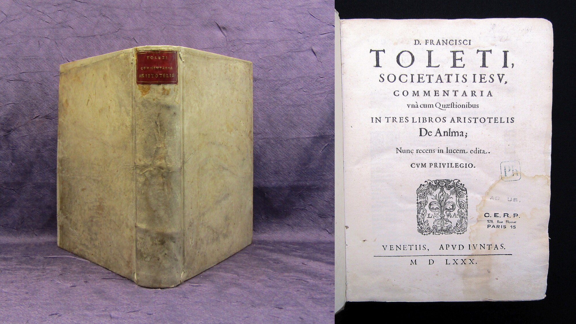 Toledo, Francisco de. Commentaria una cum quaestionibus in tres libros Aristotelis de anima. - Commentaria una cum quaestionibus in duos libros Aristotelis de generatione, et corruptione. 2 Tle. in 1 Bd. Venedig, Apud Iuntas (Giunta), 1580 u. 1575. 4° (22x17,5cm), mit zwei Holzschnitt-Titelvignetten und zahlr. Holzschnitt-Initialen, 4 nn. Bll., 183 Bll. 12 nn. Bll., 94 Bll., späterer Pgt.-Einband unter Verwendung des Original-Bezugs mit späterem RSchild. EDIT16 CNCE 27598 und CNCE 27485 - Toledos Kommentar zu "De Anima" gilt als einer der wichtigsten Renaissance-Kommentare zu dem einflussreichen und viel kommentierten philosophischen Werk, welches für das Denken der Spätrenaissance von großer Bedeutung war. Die hier dargelegten Theorien hatten großen Einfluss auf die Scholastik des 17. Jh. Toledo war ein unabhängiger, klarer Denker. Von der Vernunft geleitet, analysiert er klar den Schlüsseltext des größten Philosophen aller Zeiten und stellt seine eigenen philosophischen Thesen auf. - Einband fleckig und etwas berieben. Vorsätze erneuert. Erstes Titelbl. mit früheren Bibliotheksstempeln. Vereinzelt etwas eselsohrig und fleckig. Teils etwas wasserrandig, erstes Titelbl. und letzte Bll. stärker. 1 Bl. u. Letzte Bll. mit Sporfleck und teils im unteren Rand hinterlegt. Bestell-Nr: 3-0-235..........verkauft | ![]() | |