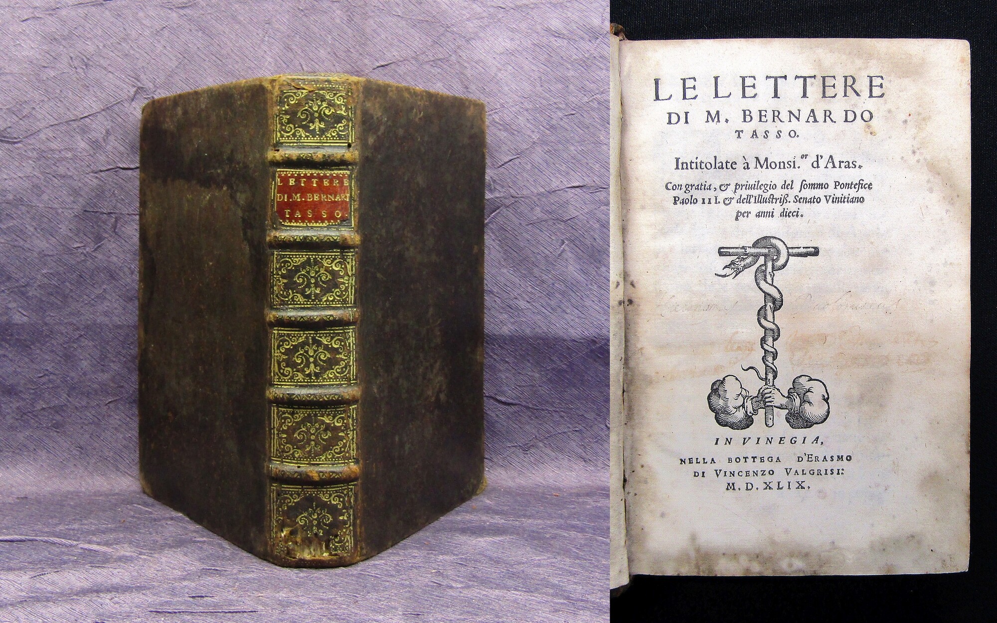 Tasso, Bernardo. Le Lettere [...] Intitolate à Monsi.or d'Aras. Vinegia (Venedig), Vincenzo Valgrisi, 1549. 8° (17,5x11,5cm), 16 nn. Bll., 477(3), Ldr. d. Zt. Basso, pp. 146-147; Edit 16, CNCE 36130; Quondam, p. 312 - Erste Ausgabe der ersten beiden Bücher der Briefe von Bernardo Tasso, die 1551 und 1553 nachgedruckt wurden. Ein drittes Buch mit sieben Briefen wurde erstmals in Valgrisis Ausgabe von 1557 hinzugefügt. 1559 wurde Valgrisi das zehnjährige Privileg gewährt ging zu Ende und die endgültige Ausgabe mit dem vierten und letzten Buch (4 Briefe) wurde im selben Jahr von Girolamo Giglio in Venedig herausgegeben. Von da an wurde die Sammlung bis zum Ende des Jahrhunderts von vielen verschiedenen Typografen (Sansovino, Giolito, Lorenzini, Bertano usw.) mehr als fünfzehn Mal nachgedruckt. - Einband berieben und bestoßen, unteres Kapital mit oberflächiger Wurmspur. Papier gebräunt und teils braunfleckig, erste ca. 35 Blatt stärker gebräunt / braunfleckig, teils etwas feuchtrandig. Vorderer Spiegel mit altem Wappenexlibris. Bestell-Nr: 3-0-236..........verkauft | ![]() | |