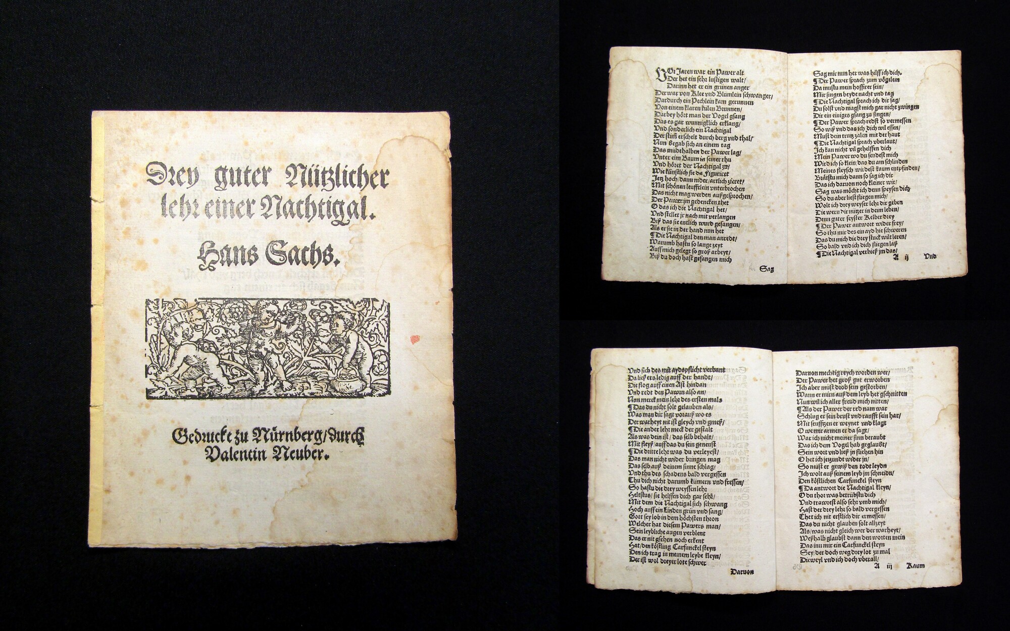 Sachs, Hans. Drey guter Nützlicher lehr einer Nachtigal. Mit Titelholzschnitt. Nürnberg, Valentin Neuber, o. J. [um 1560]. 8° (ca. 18,5 cm x 15 cm), 4 Bll. Rücken mit Heftstreifen. VD 16, S 225. - Goedeke II, 430, 54. - Röttinger 40. - Der Titelholzschnitt (ca. 10,3 cm x 4,3 cm) von Erhard Schön zeigt drei Putti inmitten von Rosenranken. Das allegorische Reimgedicht - ein Gespräch zwischen einem Bauern und einer Nachtigal - basiert auf der Aesop-Übertragung von Heinrich Steinhöwel, die 1476 in Ulm gedruckt wurde. Papier leicht braunfleckig, etwas wasserflechig und minimal knickspurig. Bestell-Nr: 3-0-241..........700,00 € (inkl. MwSt. zzgl. Versand) | ![]() | |