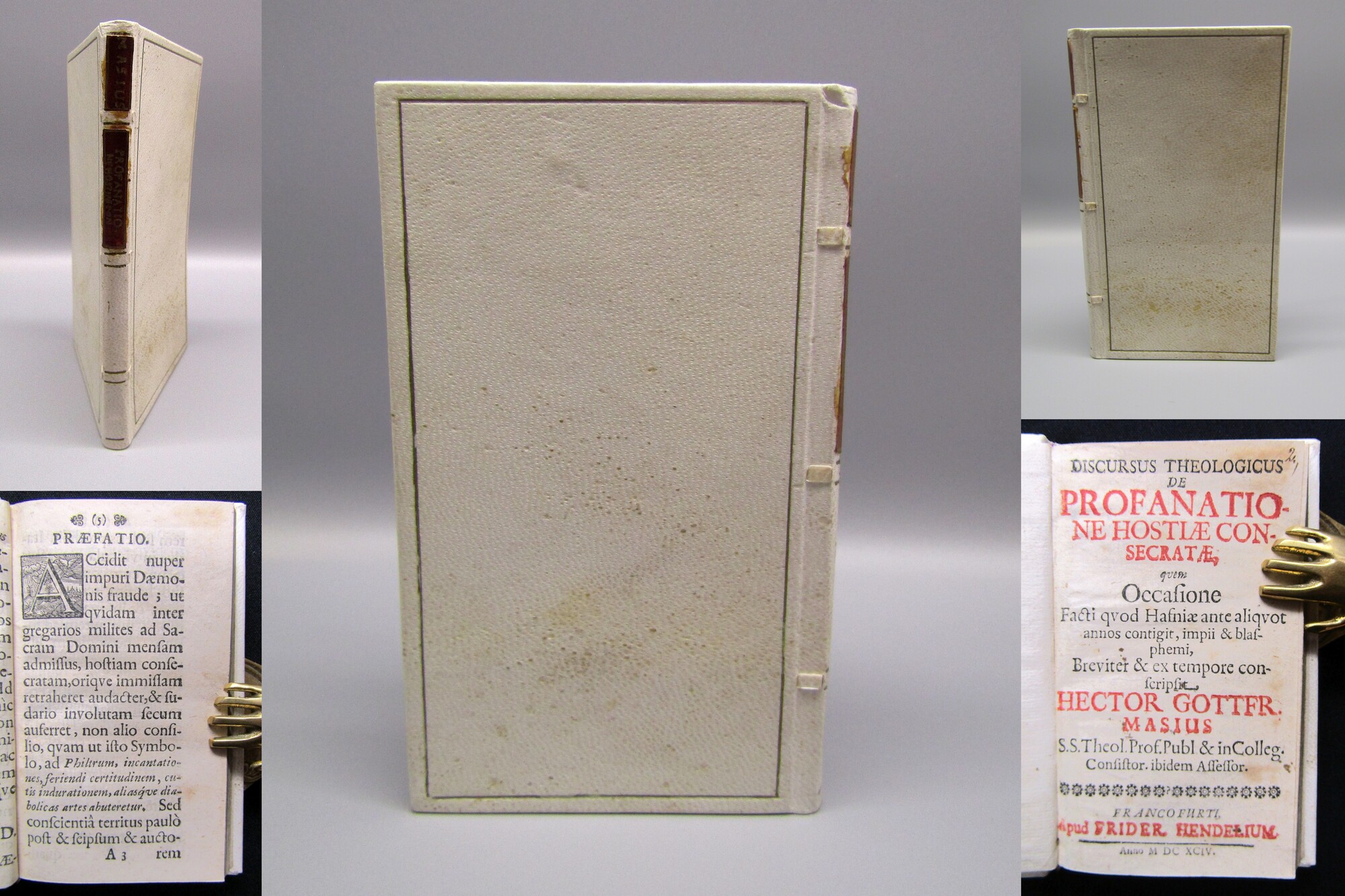 Masius, Hector Gottfried. Discursus theologicus de Profanatione hostiae consecratae. Frankfurt, Friedrich Hendel, 1694. kl. 8° (14x8cm), 116 S., neuer Pgmt. mit RS. Einzige Ausgabe. Einband im Stil der Zeit nahezu ohne Gebrauchsspuren, Titel in Rot und Schwarz. Papier etwas gebräunt, teils etwas braunfleckig. Gutes Exemplar des seltenen Titels.. Bestell-Nr: 3-0-242..........120,00 € (inkl. MwSt. zzgl. Versand) | ![]() | |