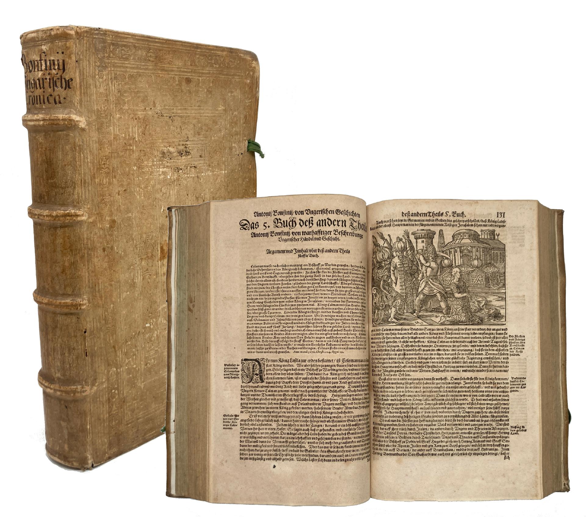 Bonfini, Antonius. Ungerische Chronica : das ist ein gründtliche Beschreibung des Königreichs Ungern: Darinn nicht allein dieses weitberühmbten Lands Könige, Hertzogen, Pfaltzgraffen, Graffen, Ertzbischoffen, Geschlecht, Herkommen, Stamm und Geschichte, sondern auch der uralten Scythier, als der Ungern Vorfahren, Ursprung, Sitten, Gebraeuch, zu und Abnemmung ihres Reichs ... Tapffere und Ritterliche Thaten ... zum fleissigsten an Tag gegeben / erstlich durch Antonium Bonifinium in 45 Büchern in Latein beschrieben: Jetzund aber ... in gut gemein Hochteutsch gebracht ... und mit schönen Figuren, sampt einem nützlichen Register gezieret, durch einen der Freyen Künste, Historien und alter Geschichten, Liebhabern, P. F. N.. Franckfurt am Mayn, gedruckt durch Peter Schmidt in Verlegung Sigmund Feyerabendts, 1581. Folio (ca. 35 cm x 23 cm), mit 1 Titelholzschnitt u. 46 Textholzschnitte 6 nn Bll, 382 S., 7 nn Bll., blindgeprägter Schweinsledereinband der Zeit. VD 16, B 6598. Apponyi 482. Ballagi 785. - Erste vollständige deutsche Übersetzung. Die frühere in Basel 1545 erschinen Übersetzung enthielt nur 30 der insgesamt 45 Bücher. - Die prächtigen Holzschnitte entstammen tlw. anderen bei Feyerabend erschienen Werken, jedoch sind "einige wie aus den ungarischen Trachten hervorgeht, für dieses Werk geschnitten". (Apponyi). Mit Titelholzschnitt und 46 Textholzschnitten von Jost Amman u. den Mongrammisten MB u. MF. Einband etwas berieben und bestoßen, mit einigen wenig störenden Wurmspuren und etwas fleckig. Vorsätze mit altem Bütten-Papier alt erneuert, Papier durchgängig unterschiedlich fleckig und gebräunt, 1 Blatt mit ca 5 cm Einriss. Gesamt ausgespochen schönes und sammelwürdiges Werk.. Bestell-Nr: 3-0-243..........zurückgestellt | ||