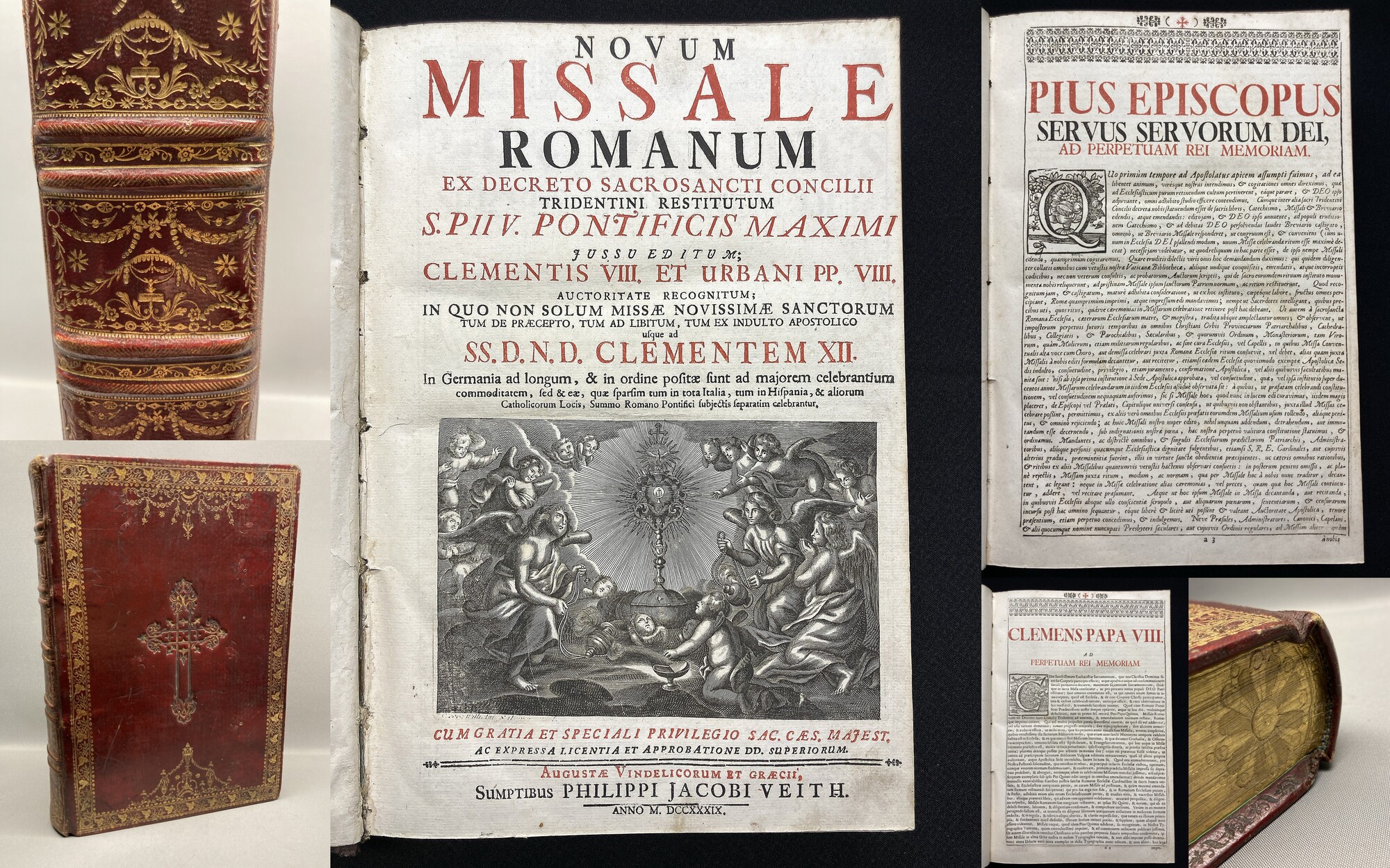 . Novum Missale Romanum Ex Decreto Sacr Osancti Concilii Tridentini Restititum S. P II V. Pontificis Maximi Clementis VIII. Et Urban PP. VIII. Auctoritate Recognitum; In Quo Non Solum Missae Novissimae Sanctorum Tum De Praecepto, Tum Ad Libitum, Tum Ad Libitum, Tum Ex Indulto Apostolico. , Philippi Jacobi Veith, 1739. 4°(33x22cm), mit einigen Stahlstichen und 1 Titelvignette und jeder Menge Holzschnittinitialien. (2), Titel, 22 Bll., 532 S., 1-cxvi, 2 S., 2 S., 2 S., 2 S., 2 S., 2 S., 2 S., Index(2 Bl.), 16 s. 11 w. Bll. goldgeprägter Ganzleder mit ziselisiertem umlaufendem Goldschnitt. Einband gering berieben und bestoßen, Schmutzbll. gestempelt, Seite 23 mit Einriss von unten, Seite 243 Ausriss unten(kein Textverlust) da am unterem Textrand. Papier gering gebräunt und hin und wieder braun-/fingerfleckig. Bestell-Nr: 3-0-253..........500,00 € (inkl. MwSt. zzgl. Versand) | ![]() | |