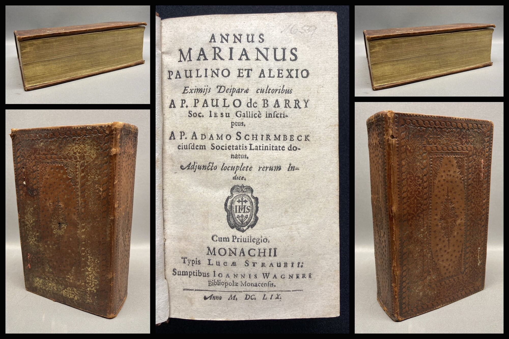 Barry, de Paulo P., Schirmbeck, Adamo Ap.. Annus Marianus Paulino et Alexio Eximijis Deipare cultoribus A P. Paulo de Barry Soc. Iesu Gallice inferiptus. München, Lucas Straub, Joannes Wagner, 1659. kl.8°(15x9cm), 2 w.Bl., Titel, 7 Bl., 8 Bl.(Index), 14 Bl.(Index),1 w.Bl., sehr dekorativer Ledereiband mit umlaufendem Goldschnitt. Einband kaum berieben, wenig bestoßen. Schließbänder fehlen, Schmutzbll. gestempelt und Papier gering gebräunt. Bestell-Nr: 3-0-255..........390,00 € (inkl. MwSt. zzgl. Versand) | ![]() | |