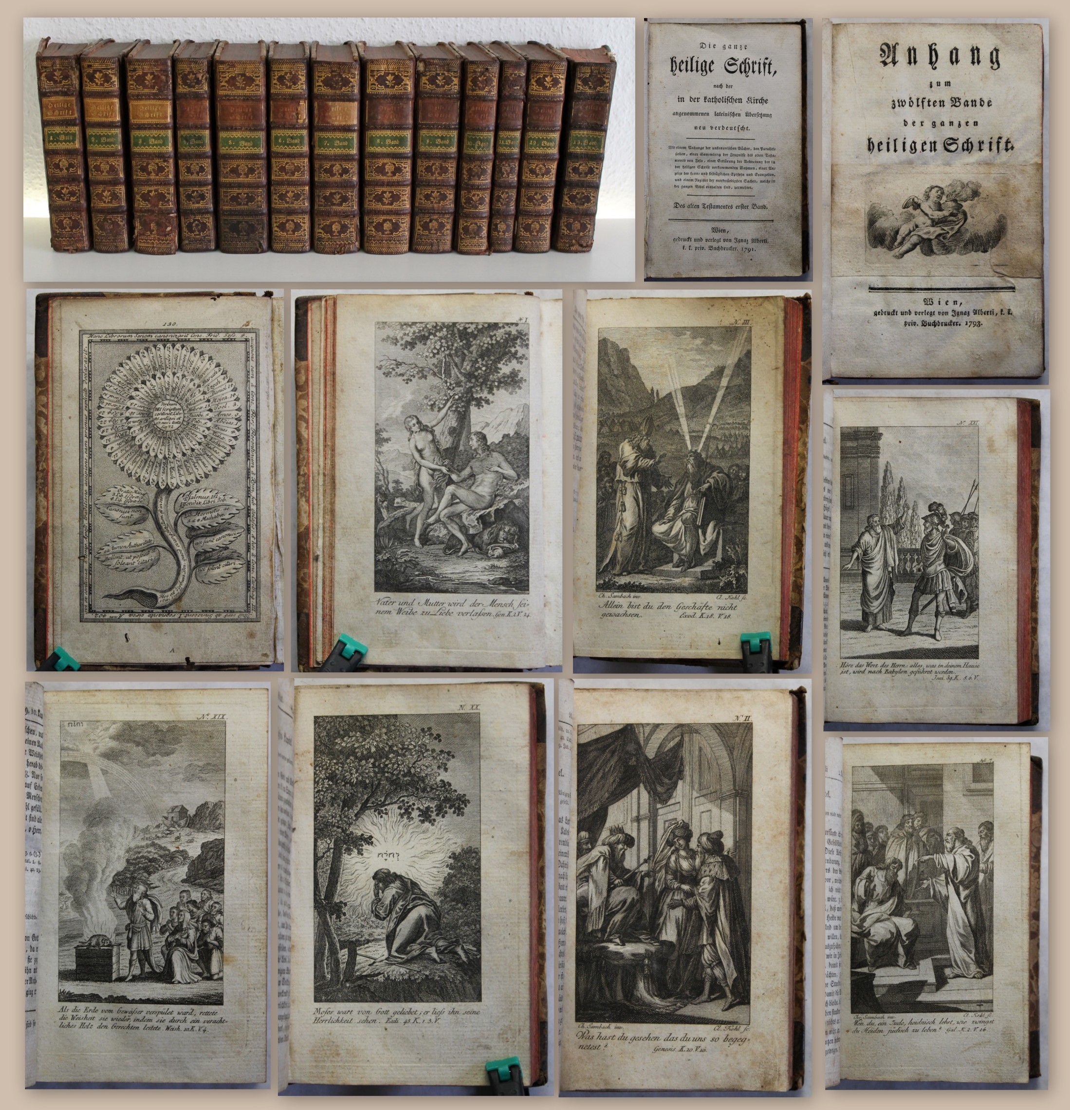 Alberti, Ignaz (Drucker und Verleger). Die ganze heilige Schrift,nach der in der katholischen Kirche angenommenen lateinischen Übersetzung neu verdeutscht [...]. 13 Bände (alles). Wien, Ignaz Alberti, 1791-1793. mit gest. Frontispiz, 36 Kupfern und einer montierten Kupfervignette in Band 13, 372 S.; 404 S., 1(w) Bl.; 1 nn. Bl., 444S., 2(w) Bl.; 361 S., 1(w) Bl.; 560 S.; 8 nn. Bll., 411 S., 1(w) Bl.; 493 S.; 506 S., 3(w) Bll.; 450 S.; 1 nn. Bl., 331 S.; 229 S., 1(w) Bl.; 416 S.; 1 nn. Bl., 220 S., 149 S., HLdr. d. Zt. mit Rückenschild und Rückenvergoldung. Schildenberger, Bibel in Deutschland, S. 277 - Erste Ausgabe. Die anonyme Wiener Bibel. ?Die ganze heilige Schrift, nach der in der katholischen Kirche angenommenen lateinischen Übersetzung neu verdeutscht" kam in den Jahren 1791 bis 1793 ?gedruckt und verlegt von Ignaz Alberti, k. k. priv. Buchdrucker" in Wien heraus. Die Ausgabe besteht aus zwölf handlichen, eleganten Lederbändchen, sie trägt weder den Namen des Übersetzers, noch enthält sie ein Imprimatur oder eine sonstige Druckerlaubnis. Der lange Titel gibt eine Übersicht über all das, was in den Bändchen enthalten ist. Interessant ist die Einleitung, in der der Übersetzer den Hauptinhalt aller Bücher heraushebt. Einige von ihnen seien genannt: Die Schöpfung des Menschen und die Sünde, die Ankunft Christi, unseres Heilandes, und seine Gottheit, Christus, das Opferlamm zu unserer Versöhnung, und der Urheber unseres Friedens mit Gott, gute Werke, Christus, unser Lehrmeister, hoher Priester, Mittler, Vertreter, die Bibel, unsere Lehrerin zum ewigen Leben. Mit dem zehnten Bändchen beginnt ?Das neue Testament Jesu des Gesalbten". Ein echtes Kind seiner Zeit! - Einbände berieben, bestoßen, etwas wurmspurig. Vorderer Deckel von Band 13 mit Bezugspapierfehlstelle. Einige Rückenschildchen fehlend. Papier altersbedingt etwas gebräunt, durchgehend unterschiedlich (finger)fleckig, teils mit Feuchtigkeitsrand. Wenige Seiten mit Wurmspur bzw. Wurmlöchlein ohne Textverlust. Eine Seite mit alt angefügtem Eckabriss. Wenige Seiten mit kleinem Einriss. Insgesamt noch gutes Exemplar des sehr seltenen Titels. Bestell-Nr: 3-0-26..........verkauft | ![]() | |